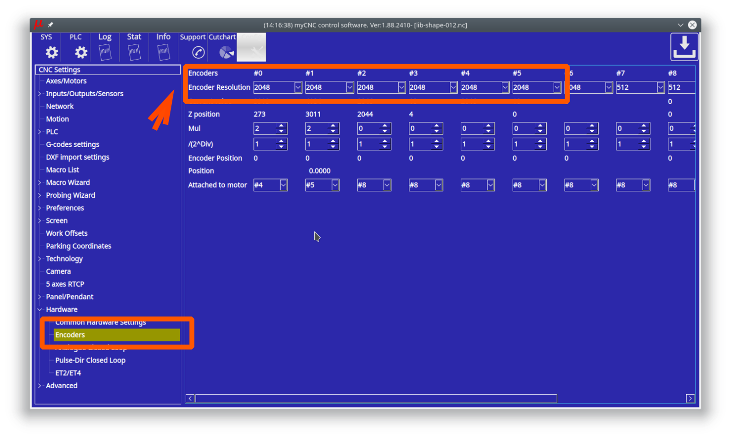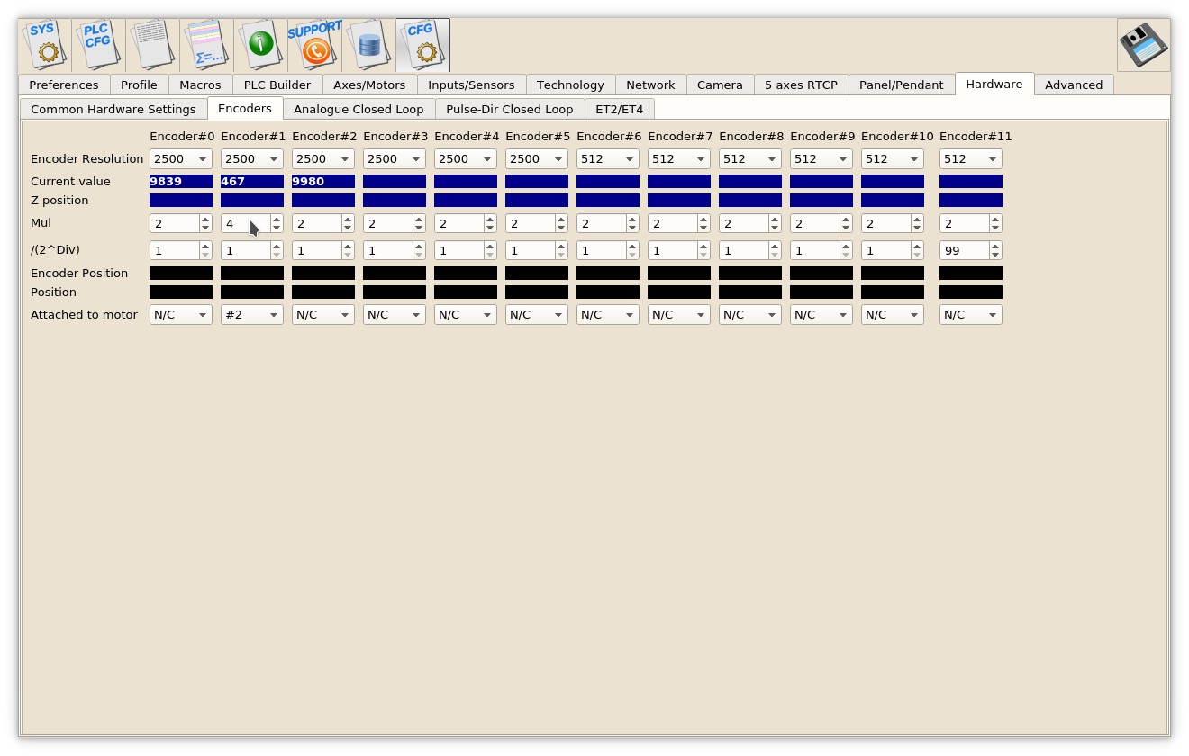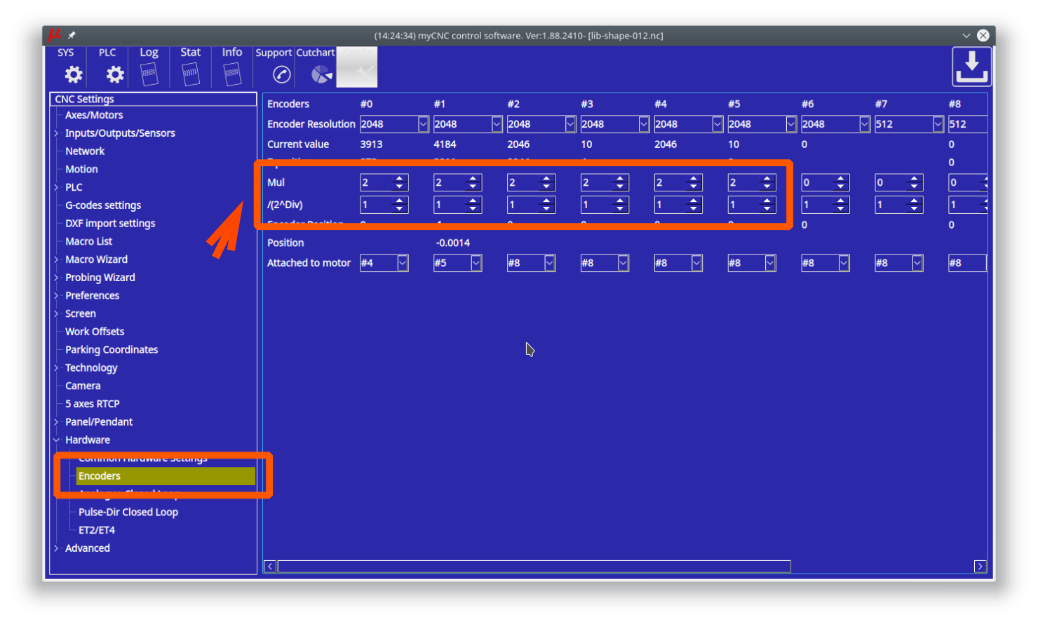 Multiplicator and divider ratio needed for pulse-dir closed loop system to adjust encoder resolution (encoder lines-per-rotation) to motor driver pulse-dir resolution. For Analogue closed loop system this ratio should be "1"