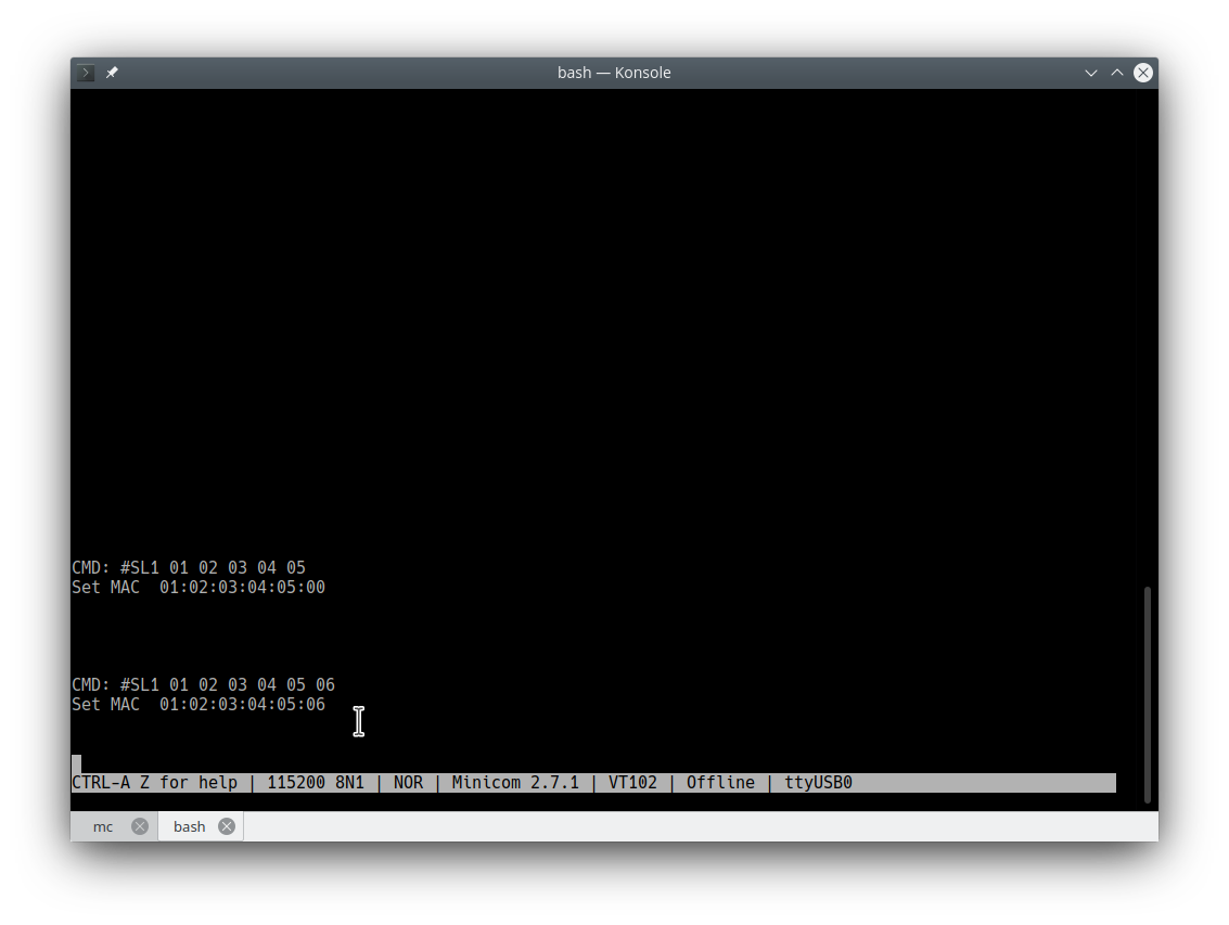 #SL1 {A} {B} {C} {D} {E} {F} | Set the MAC address, ABCDEF values are in range of 0…255 | #SL1 01 02 03 04 05 06 sets the MAC address to 01:02:03:04:05:06 |
