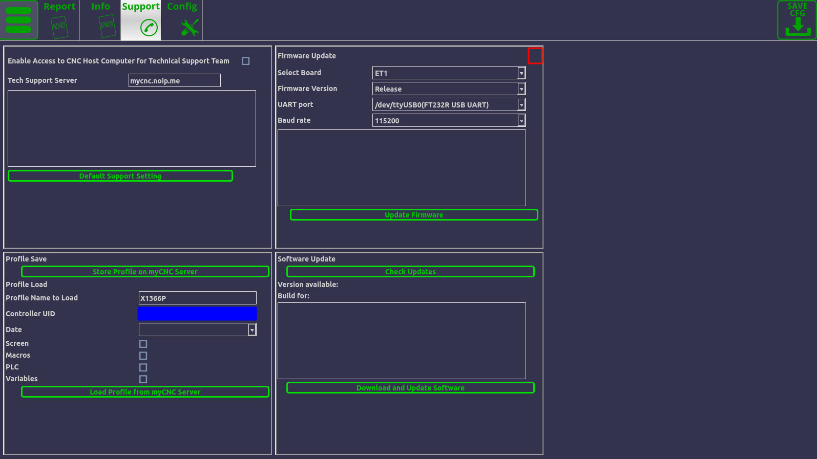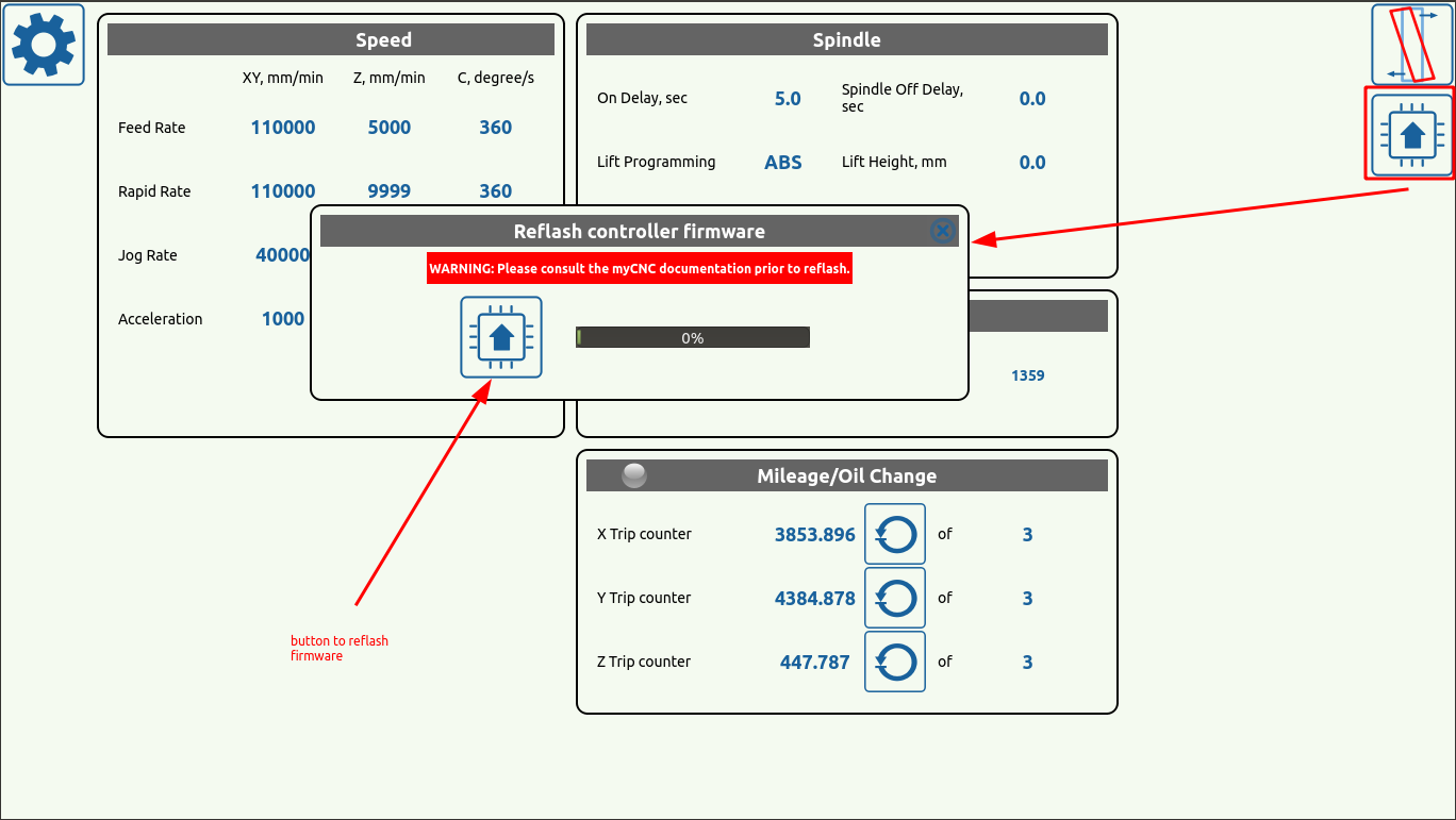 WARNING: Unlike updating the myCNC software, the firmware CANNOT be downgraded after a reflash. The myCNC team recommends reflashing the control board firmware as a last resort only, and recommends seeking an explicit confirmation from the support team that the firmware reflash is warranted in order to avoid issues.