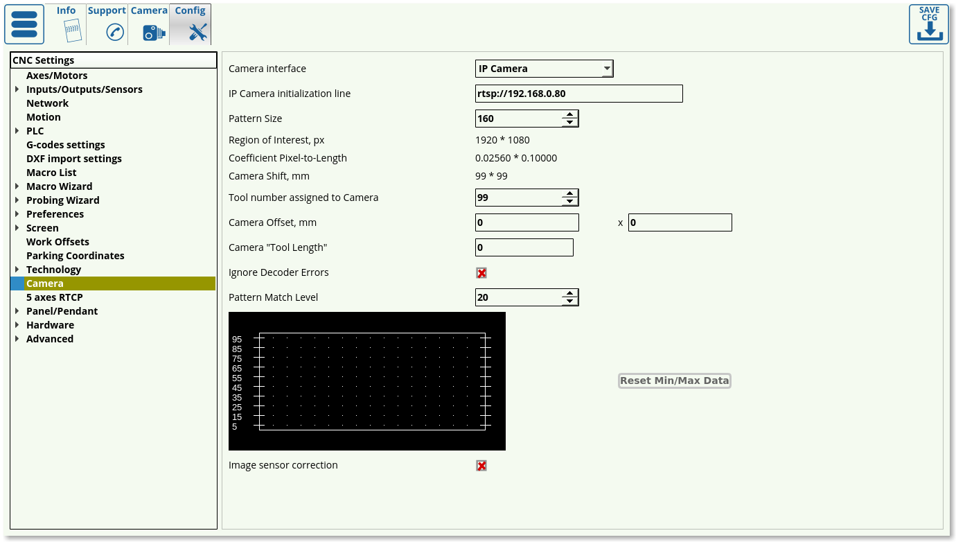 In order to set up the camera, you must go into the CNC Settings > Config > Camera. The screen presented to you will be the one shown below: