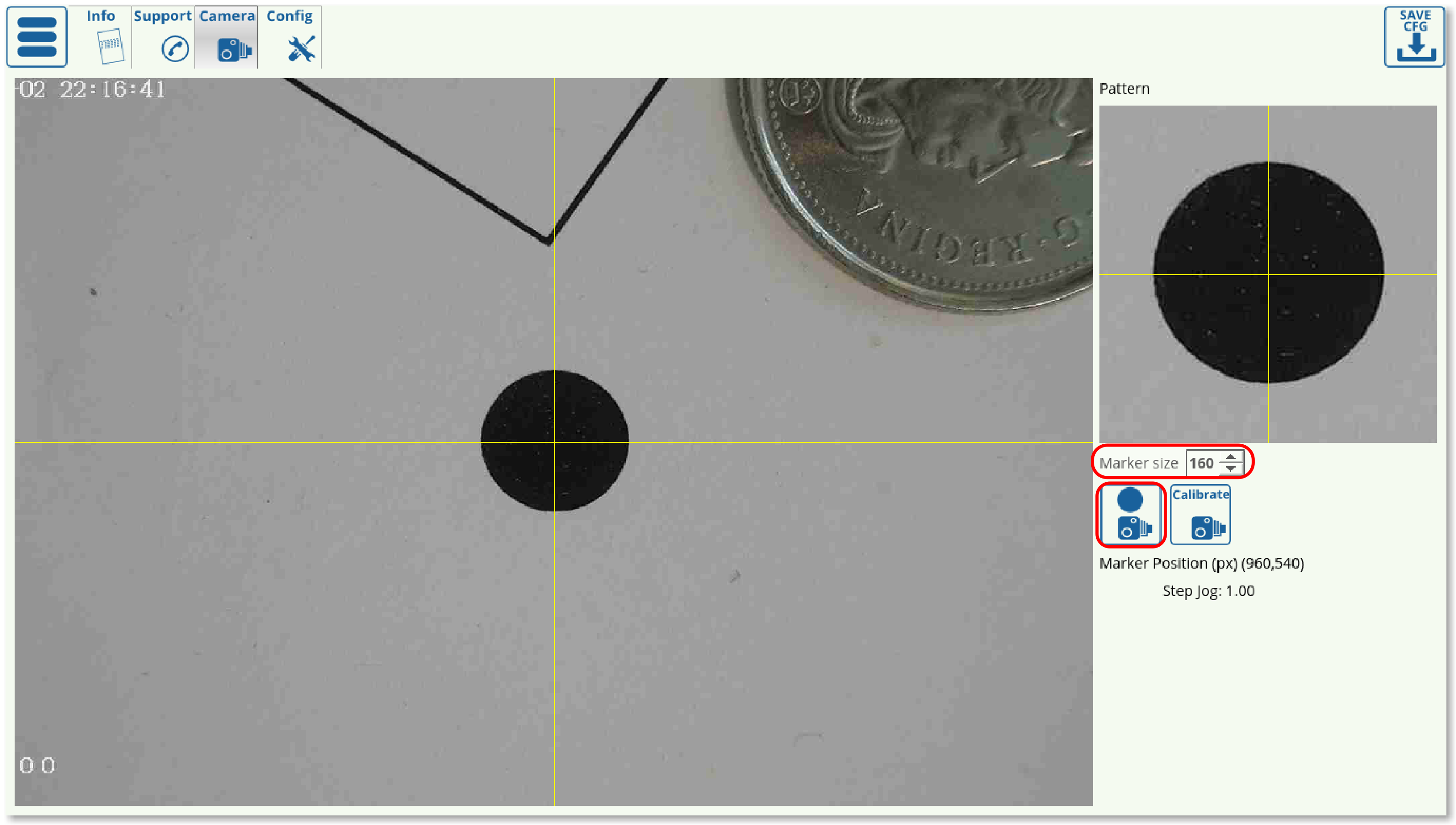 Pixel to length coefficient is used to convert the pixels travelled into the actual physical distance moved, in mm. You are able to calibrate this for both the x- and the y-axes. In order to set up the correct coefficient for your camera, use the Calibrate button in the Camera tab, or consult the full set of manual set up instructions below (useful for older software versions).
