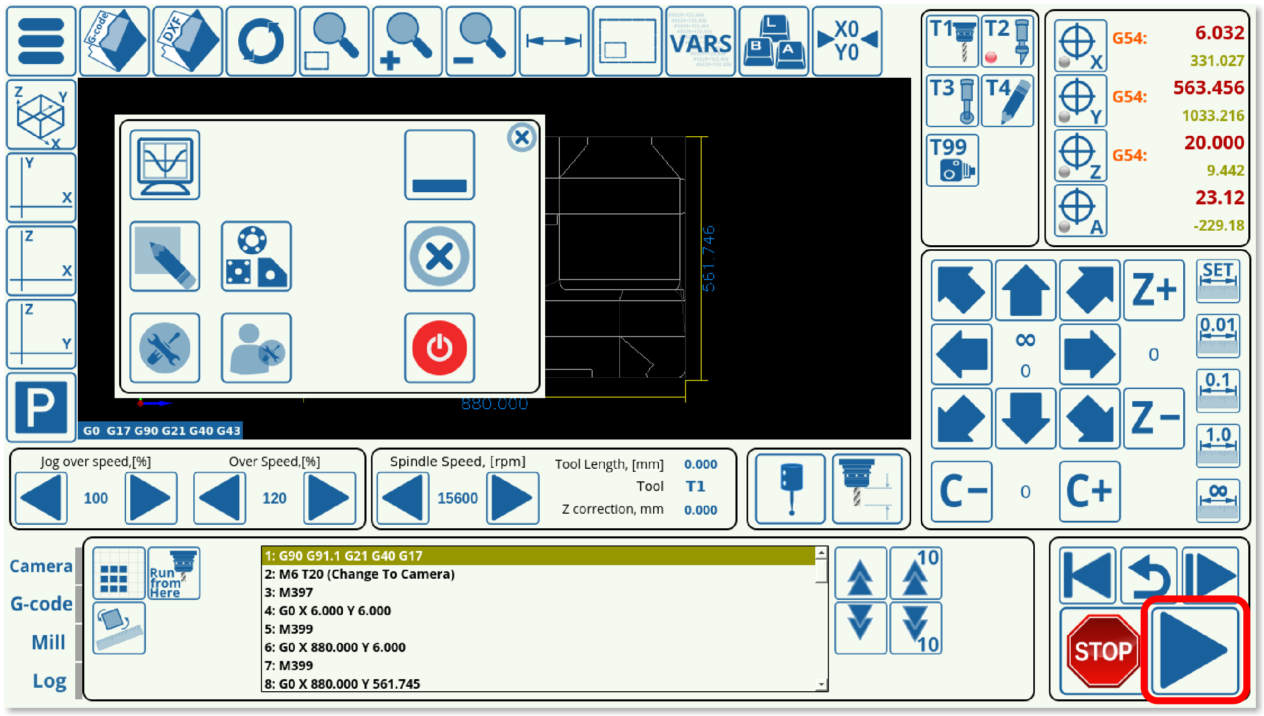 4. Once you have loaded the DXF file, the program should now have inserted the M397, M398, and M399 macros which refer to camera actions into the program G-code.