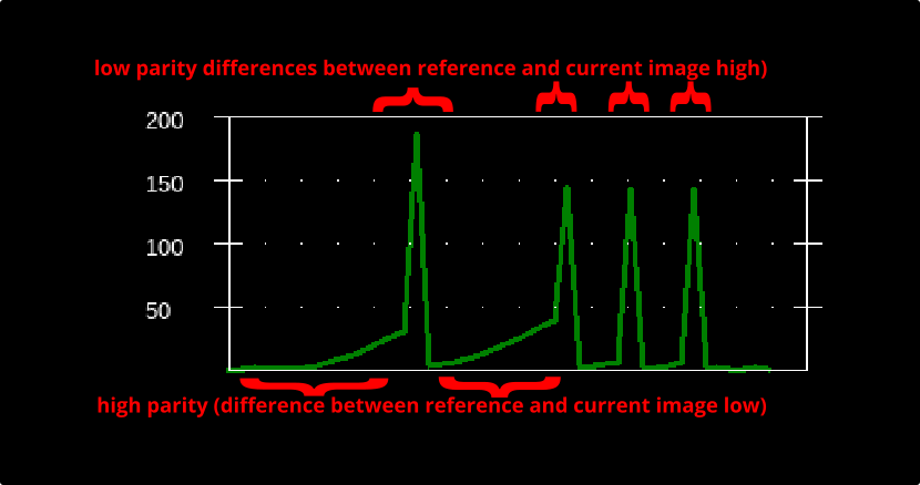 Pattern Match Level describes the level of parity with the original reference registration marker that each new marker must have for the system to recognize it. Higher numbers mean less parity (more differences between the markers), so as to avoid false positives it is advised to keep the numbers on the lower end of the scale. The graph below the Pattern Match Level indicates the parity levels during the machine search for markers, with the low points of the graph being indicative of the places where marker parity is highest (differences between new marker and reference are lowest).