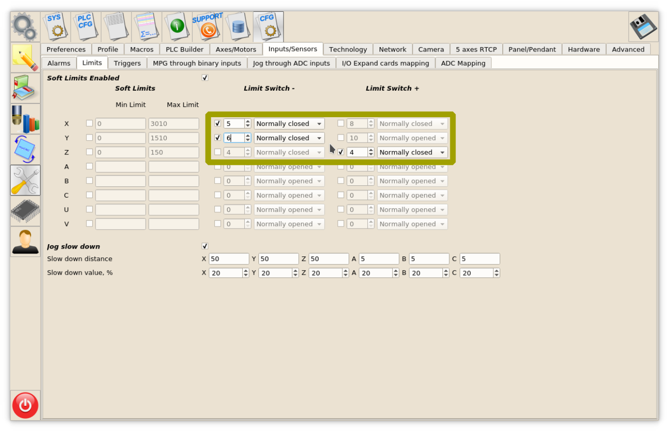 The inputs should be configured in “Inputs/Sensors” - “Limits” settings dialog if Home sensors are used as Limit Switches as well If Home sensors are used as Limit switches like on the table below