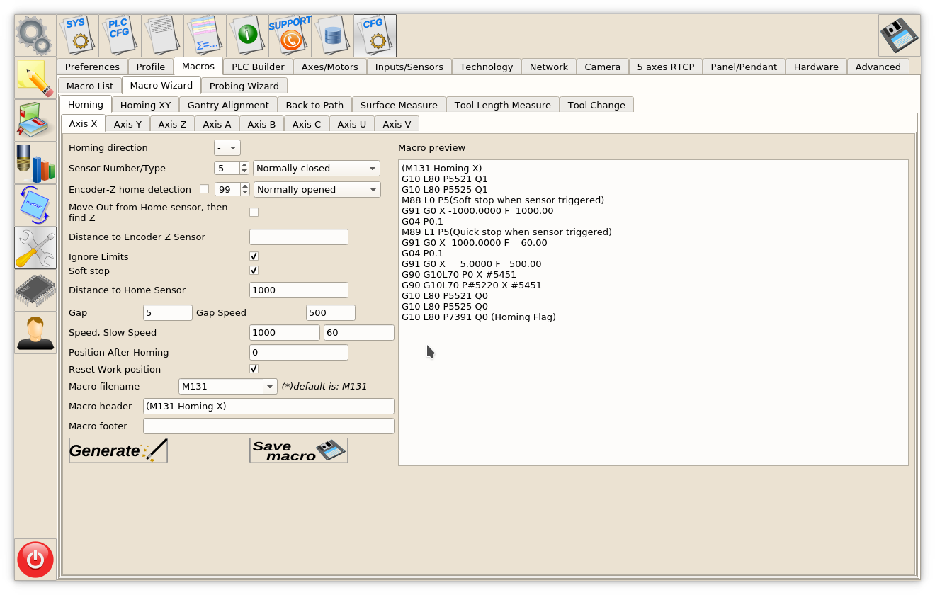 - Press Save Macro to save the Homing X macro to M131 file on the disk