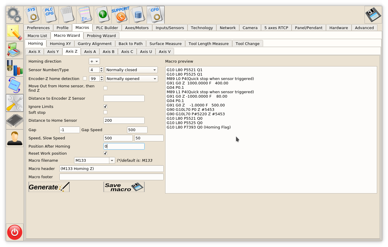 Home sensor numbers should be configured in Macro Wizard accordingly and Homing procedures for X, Y, Z axes generated.