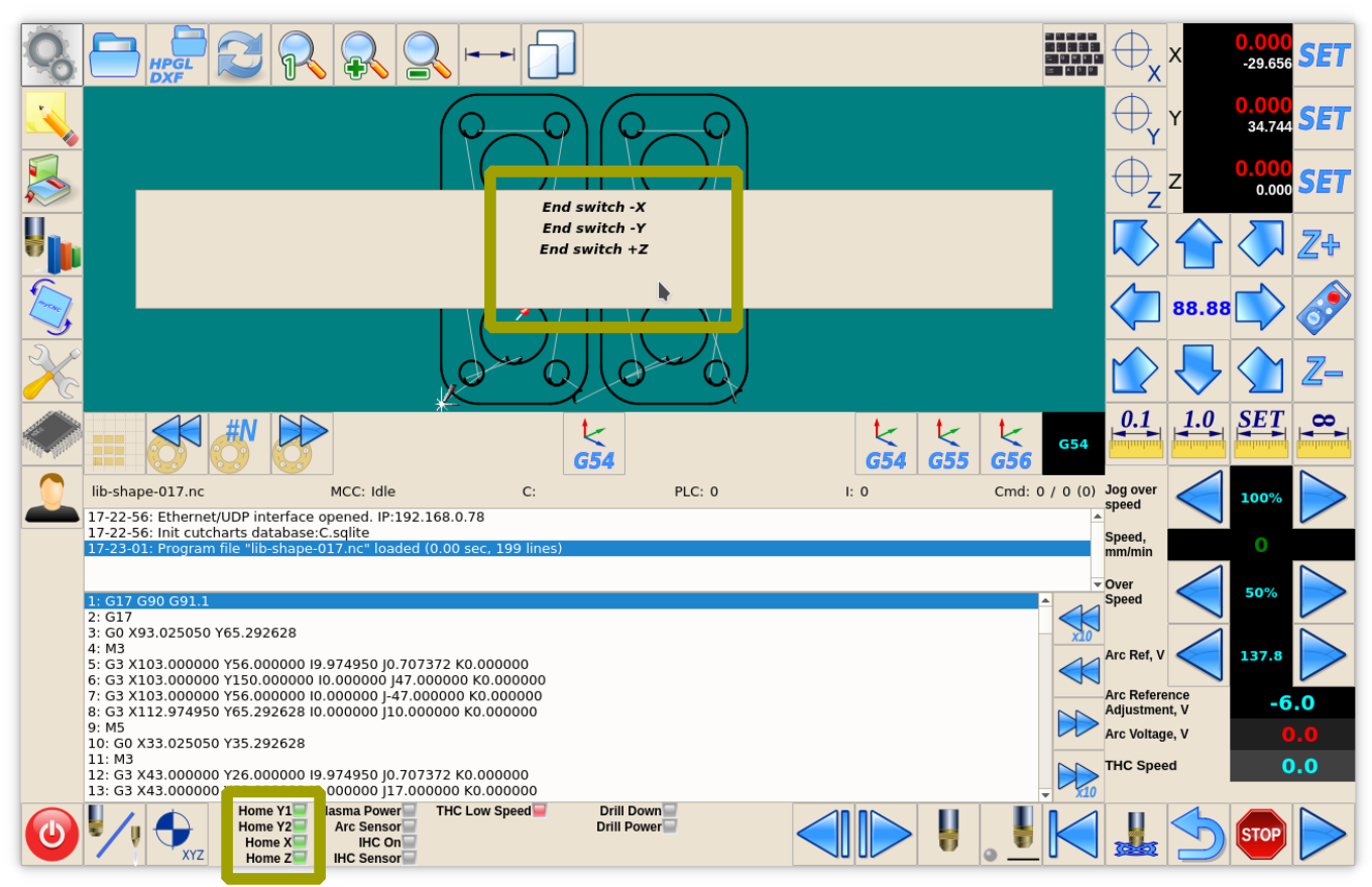 If Limit switchers configured and any of it is activated, job running will be stopped and Error message showed in the centre of the main screen