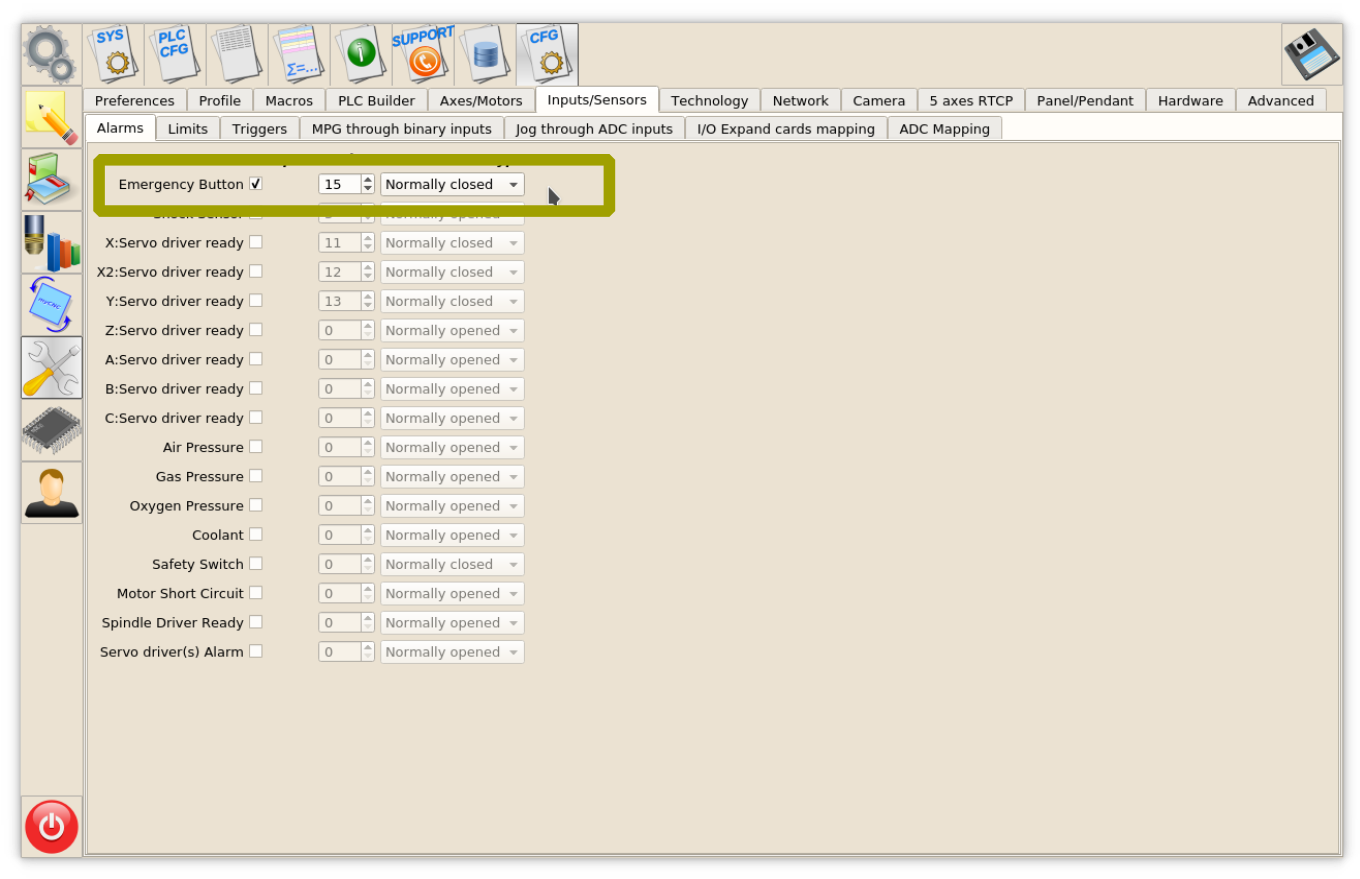 An emergency stop should be set up in “Inputs/Sensors” – “Alarms” setting dialog. Emergency setup is shown below