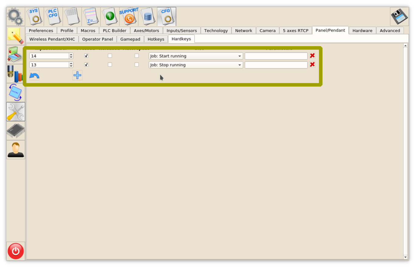 Inputs can be used as Hot Keys. Binary inputs IN14 and IN13 can be configured as “Start” and “Stop” keys in “Panel/Pendant” “Hardkeys” settings dialog. See inputs configuration o a picture below. To configure buttons press “+” button, select input number (13 or 14), select “Pressed” checkbox and choose Slots: