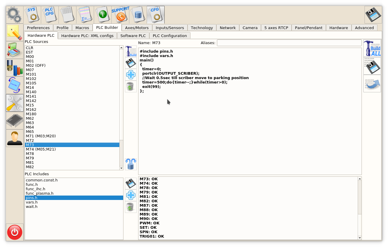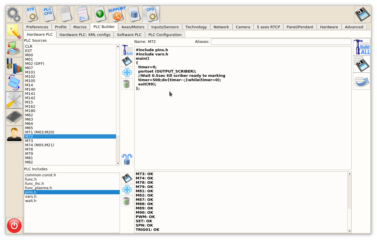 We offer to use M71 code as Start Cutting and M74 code as Stop Cutting. Codes M03/M05 are widely used to Cutting on and off also. We recommend to use this codes however any other codes can be selected and PLC procedures created and compiled in PLC Builder.