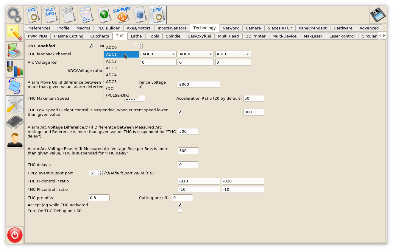 ADC1 channel should be configured as THC#1 feedback channel (THC#2…THC4 are reserved for Multi-Head Gas cutting machines).