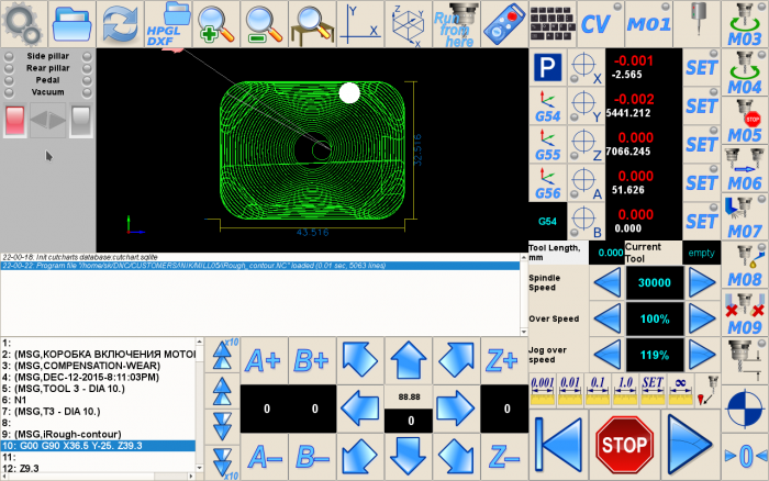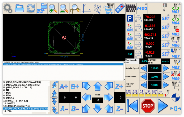 For this example, the machine runs the same G-code on left and right sides of the machine table. To increase performance, the operator will remove the ready (finished) parts and will install a new blank piece of material on one side of the table while the machine cuts new parts on another side.