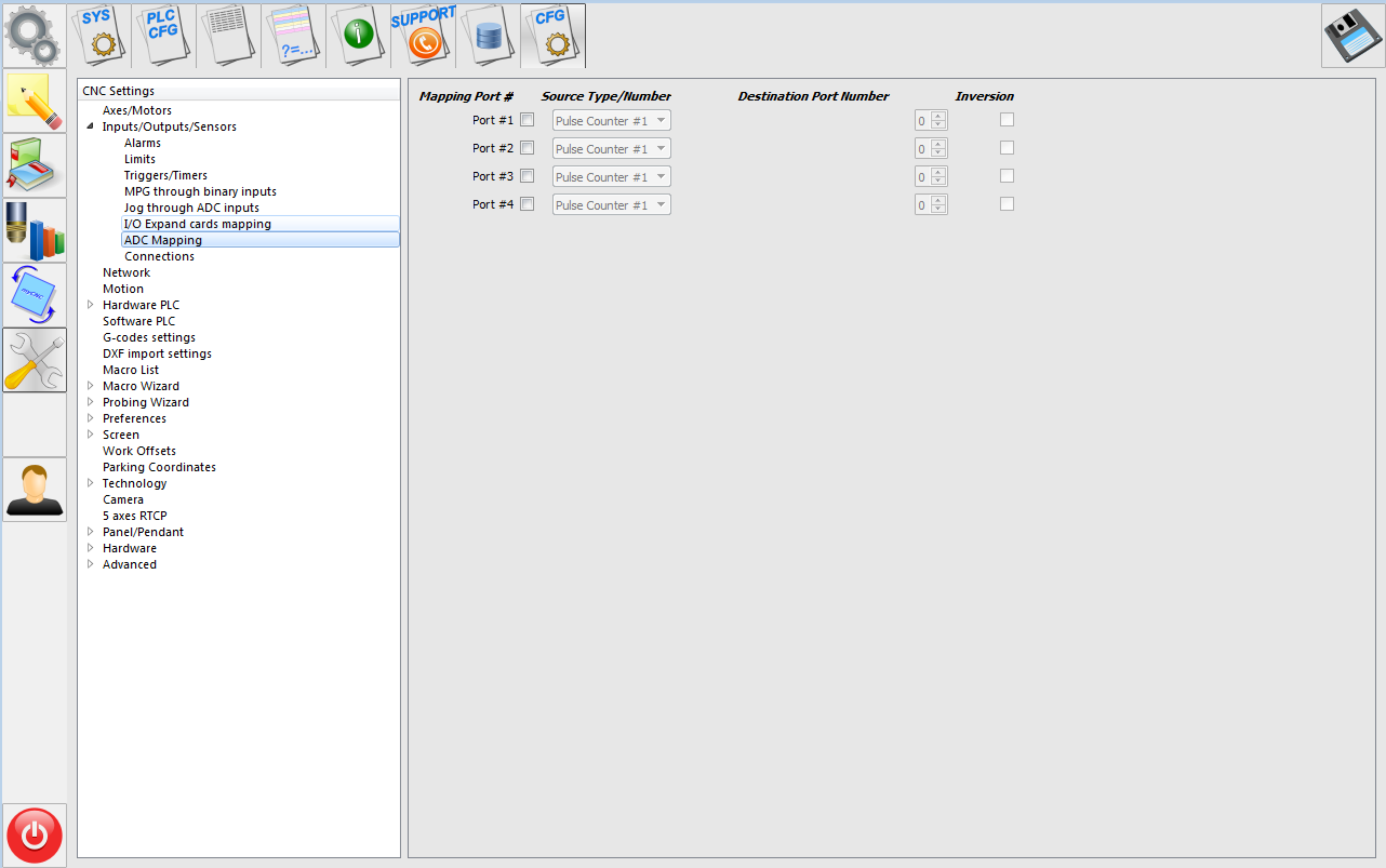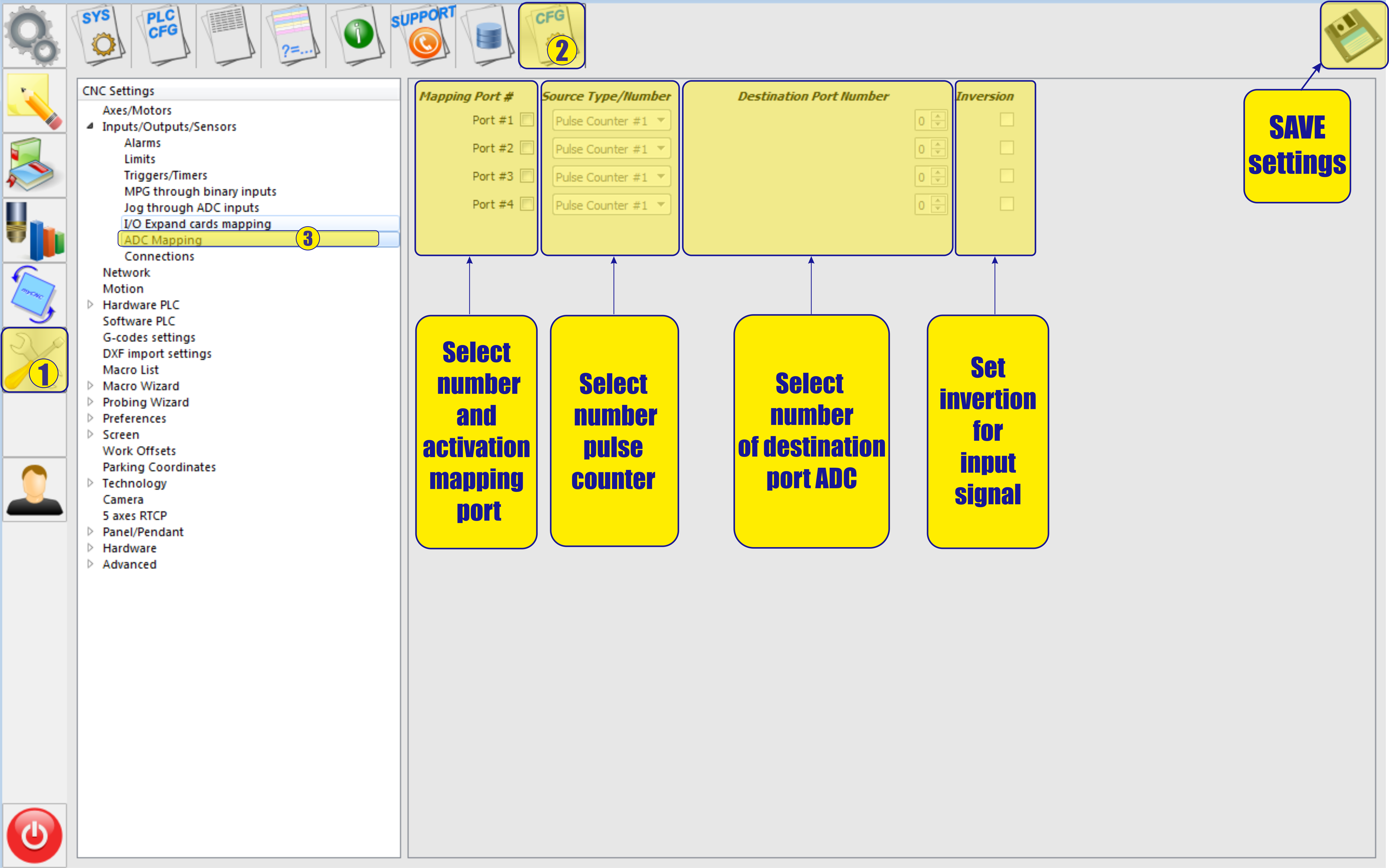 - Activate channel 1 in the settings menu of the ADC mapping. Select number of counter # 1.