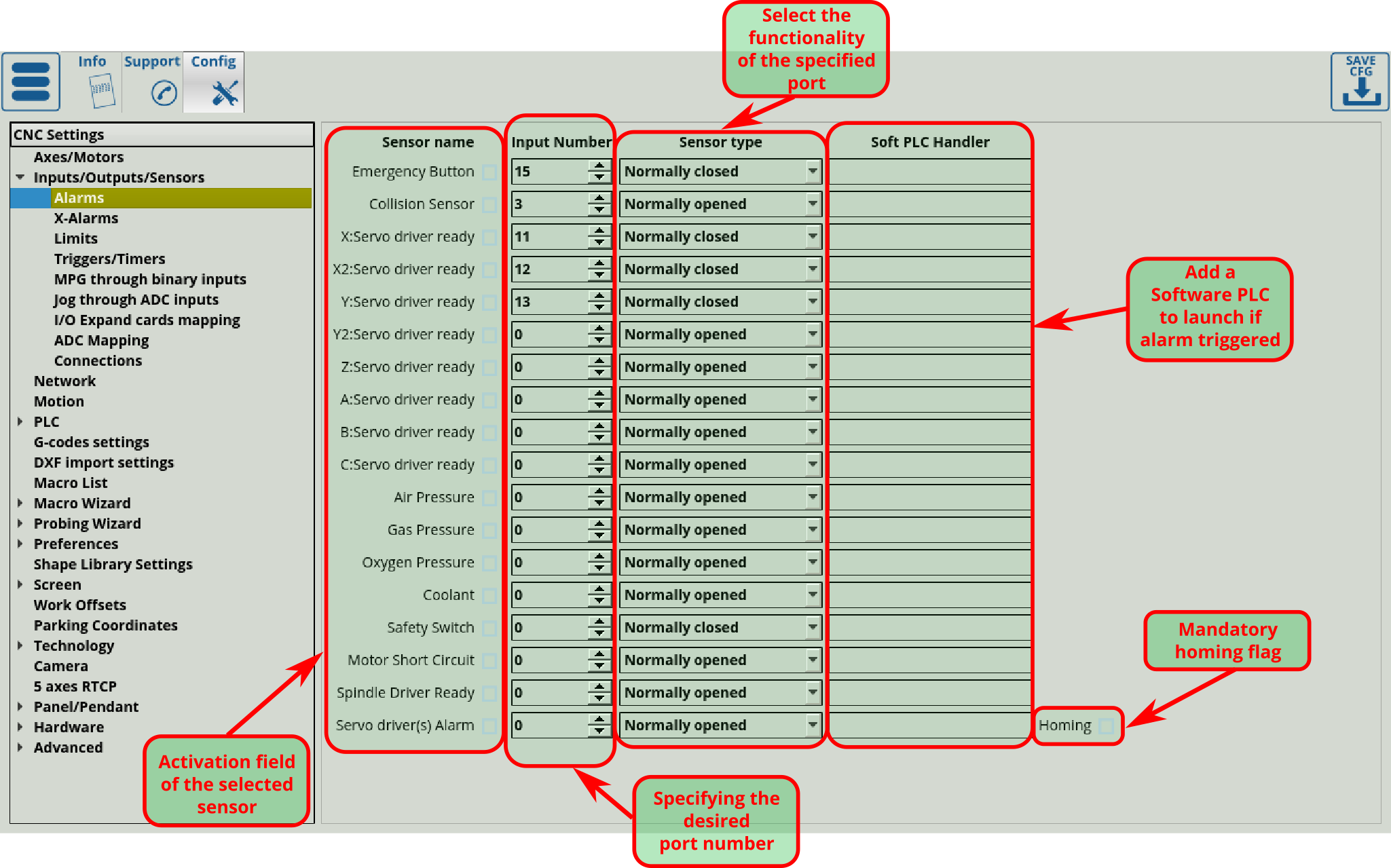 This section allows you to specify the alarm inputs and the response to these sensors. To navigate to it, you can head into your Main Menu > Settings > Config tab > Inputs/Outputs/Sensors > Alarms.