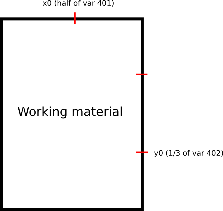 In the M190.plc code above, variables “x0” and “y0” are used, which are obtained by using the variables 401 & 402. In case of this specific example, the variables are taken from the data fields that are located on the main screen of the custom profile: