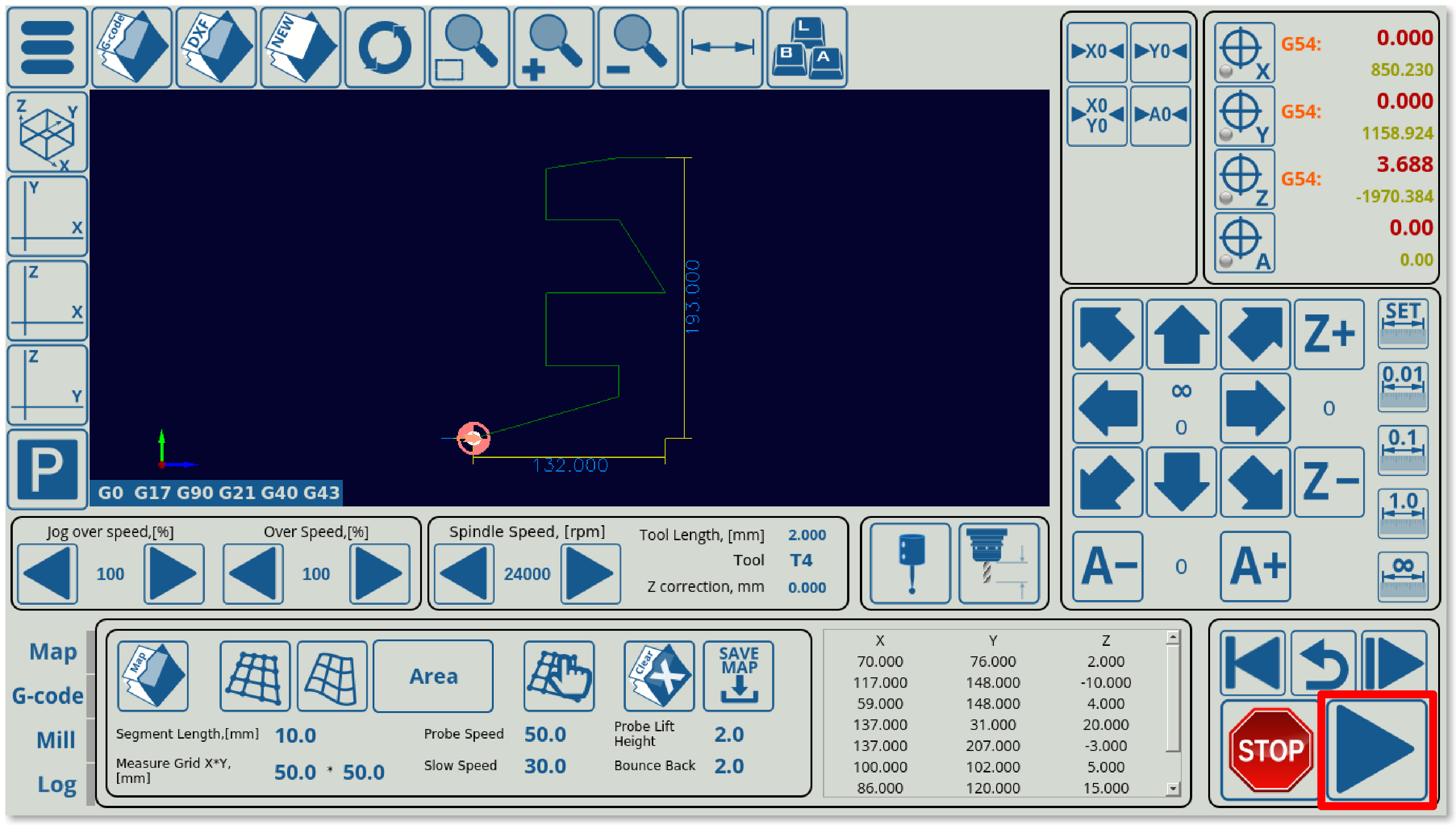 - Press the Generate Map button. Note that in order for the map to position itself properly, the X and Y program coordinates must be at zero prior to the map generation step.