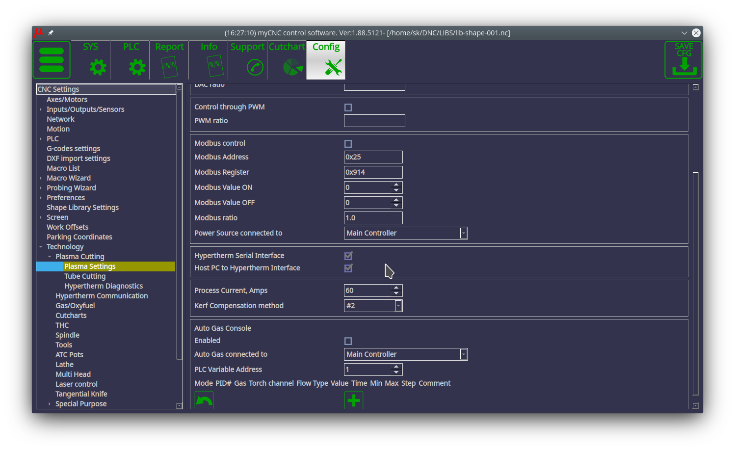 - To enable AGC functionality, first navigate over to Settings > Config > Technology > Plasma Cutting > Plasma Settings and enable the Hypertherm Serial Interface and Host PC to Hypertherm Interface options: