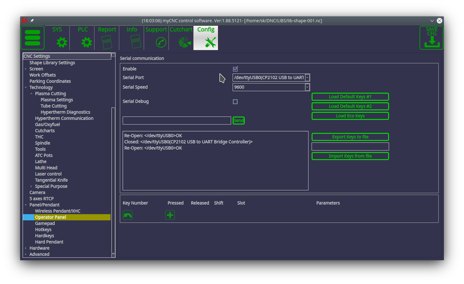 - Next, head over to Config > Panel/Pendant > Operator Panel. Here, you can configure the connection parameters by setting the Enable checkbox to ON, as well as selecting the Serial Port number and Serial connection speed with the Hypertherrm console. Note that a UART-RS422/485 or a USB-RS422/485 adapter is required for physical communication with the AGC.