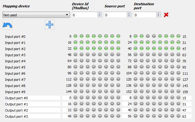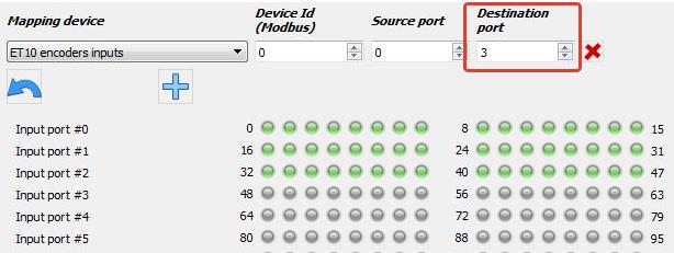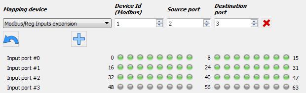 - This example shows how to connect an external controller to the modbus interface. At the remote controller with id = 1 input port number 2 (inputs from 32 to 47) is pushed to the input virtual port of controller number 3 (inputs from 48 to 63). The LED layouts below show the state of the port for each of the inputs.