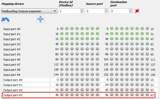 - Similarly, mapping is also established on output registers.At the remote controller with id = 1 output port number 2 (outputs from 32 to 47) is pushed to the output virtual port of controller number 3 (outputs from 48 to 63). The LED layouts below show the state of the port for each of the outputs).