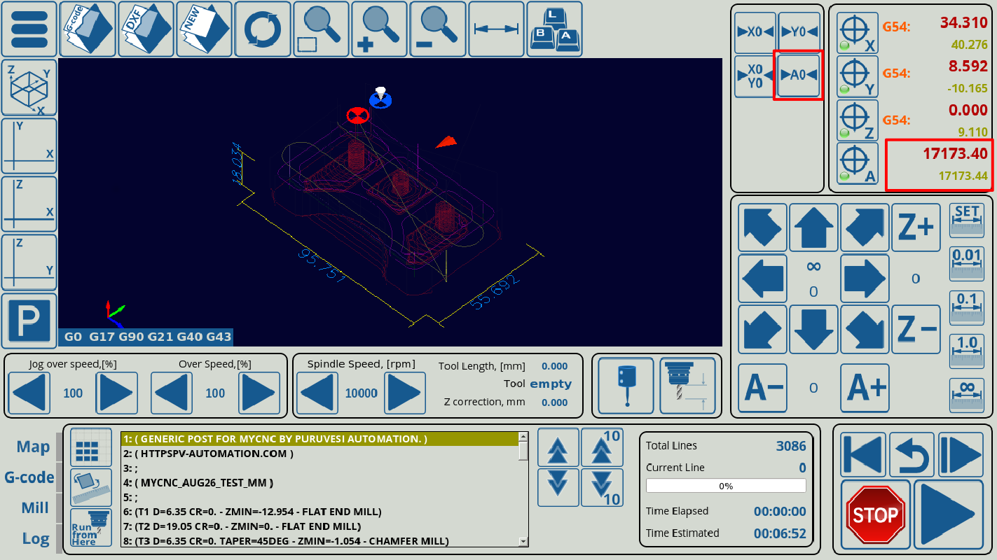 At the start of a new job which uses the A axis, the A position will have to be rewound back to zero before starting a new run. Jogging (physical rotation) to “0” from a large A position left over from the previous job may take a considerable time (can be hundreds of complete turn to run). In some cases it's possible to simply reset the A axis position to zero at the end of the job run, indicating that whatever point the A axis has stopped at will be the next zero, thus saving time on the rewind process. This, however, runs into the problem of losing the proper A-axis orientation which may then require homing. Therefore, the best way to keep the A-axis orientation, but still save time by foregoing the physical rewind back to zero, is to reset all complete rotation turns of the A axis (each 360 degrees), and then physically jog to the A-axis “0”, retaining the previous A-axis orientation.