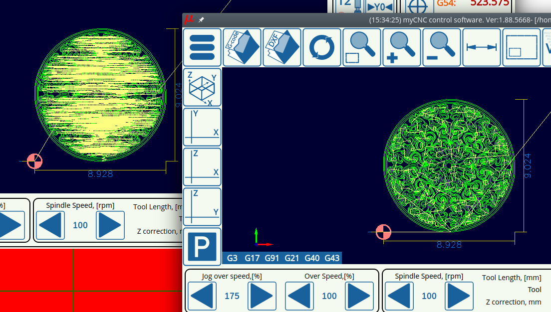 - “Constant surface speed” - Tooltip is moving on the surface of turning material. Turning speed is calculated depending on the given F-feedrate and the tooltip cutting speed on the surface (It's supposed that a tooltip is moving in an arc motion with radius depending on current XYZ position).