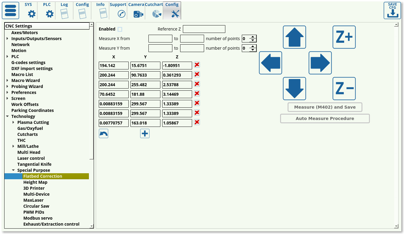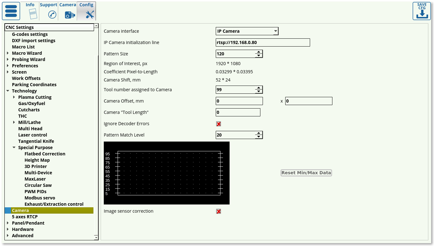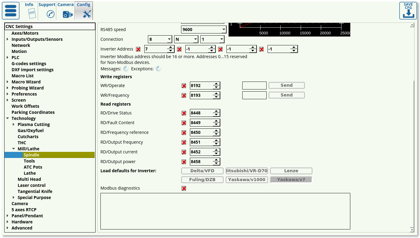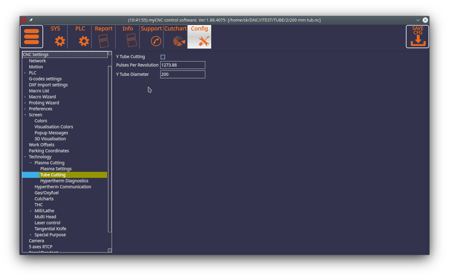 - Tabs shown after pressing the Settings button from the main screen of myCNC software can also be configured here. These include System, Support, PLC, Stats, Log and Cutcharts tab.