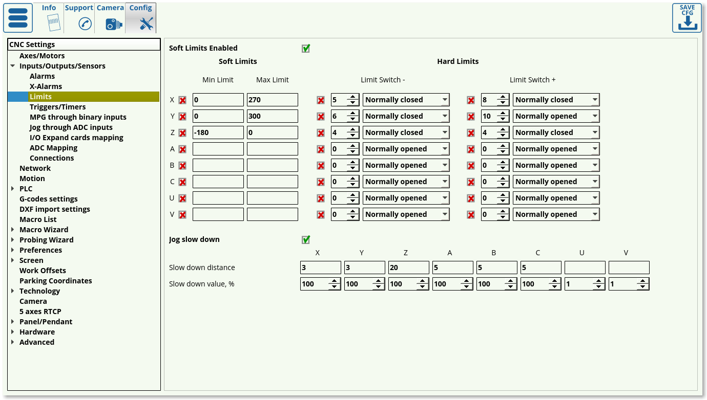 Besides having general software limits, hardware limits can also be configured in myCNC software. This is done by using a switch for the negative and positive direction of each axis which can be reserved within the myCNC software. Any switch can be enabled, and then assigned to any of CNC control board binary input and configured as “Normally Open” or “Normally Closed”. To enable the hardware limits for any selected axis: