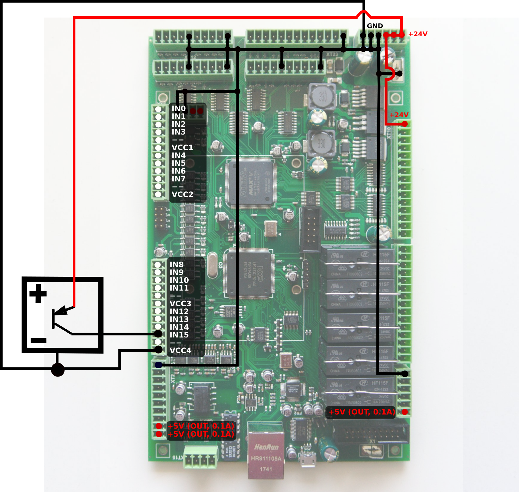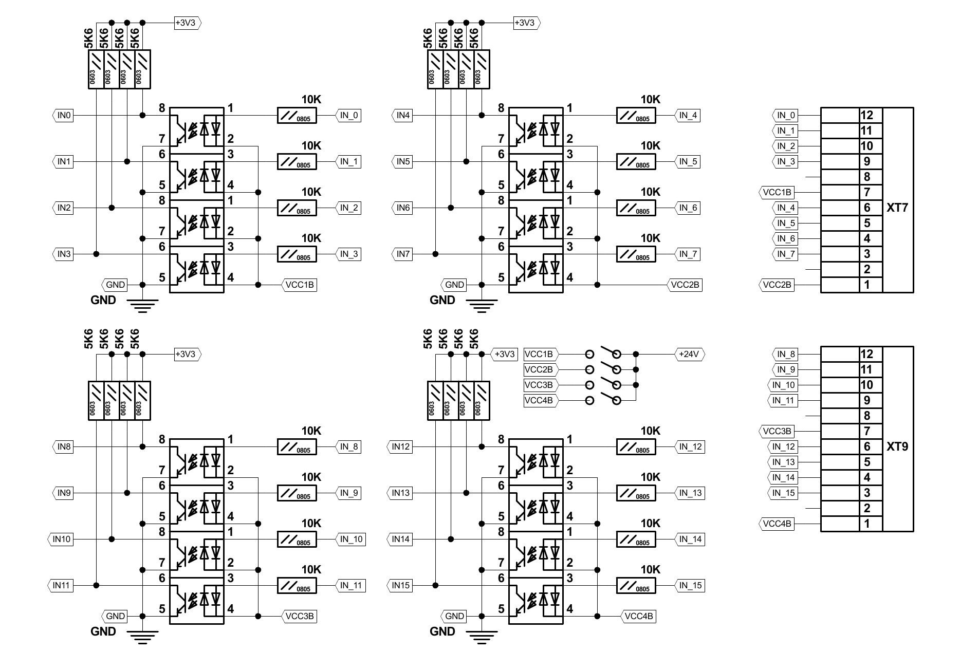 ET7 control board has 16 galvanic isolated binary inputs, 4 groups of 4 inputs each. Each group has separate power supply pins so inputs can be powered from different power sources. Using PNP and NPN sensors simultaneously is possible too.