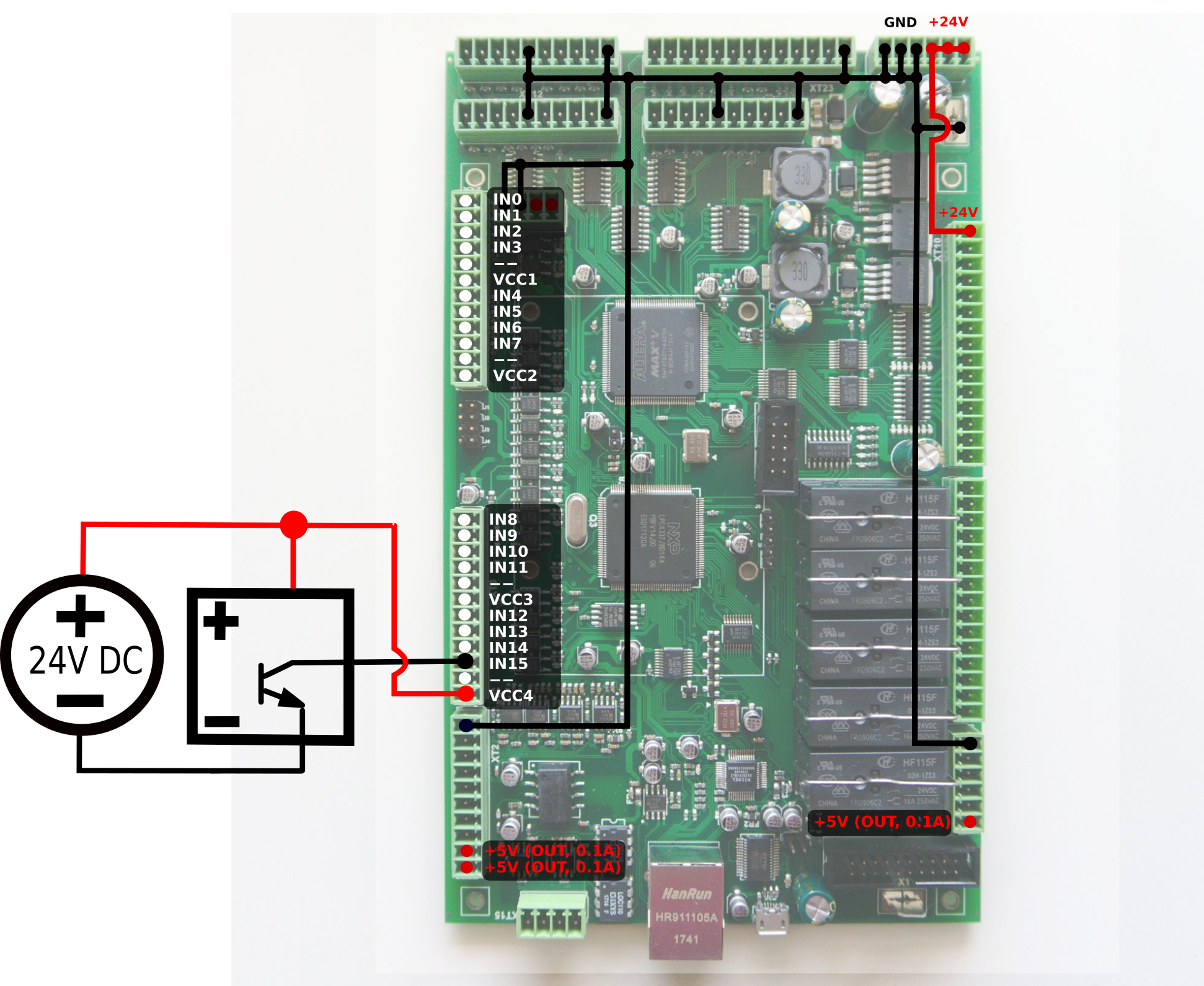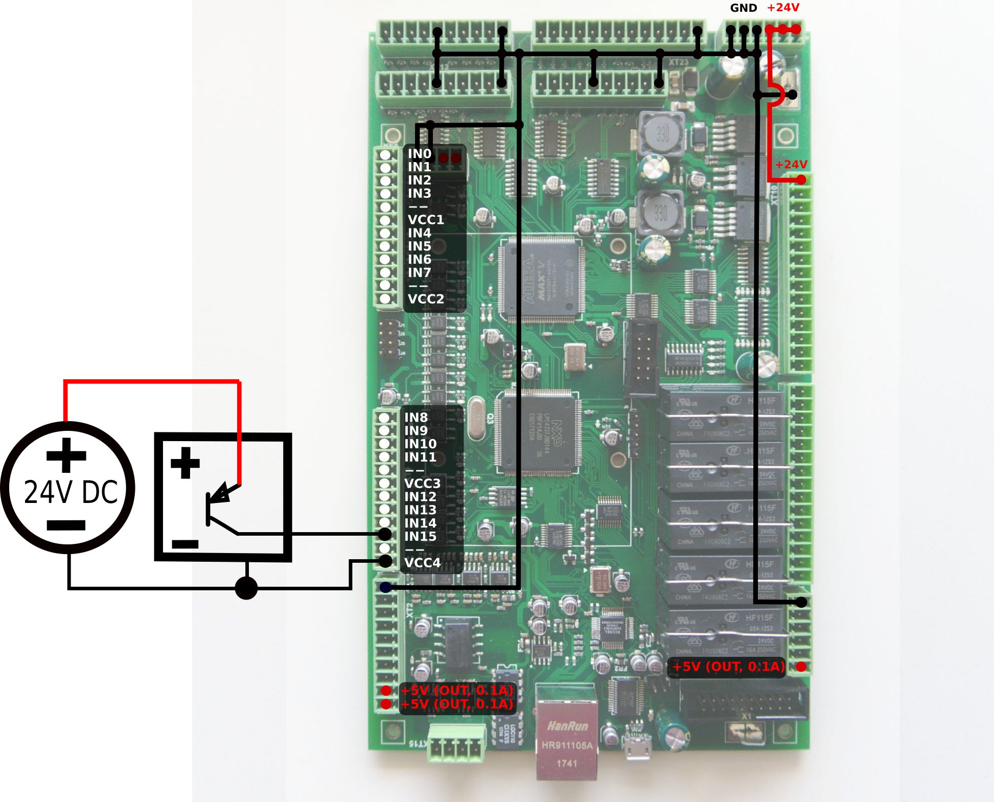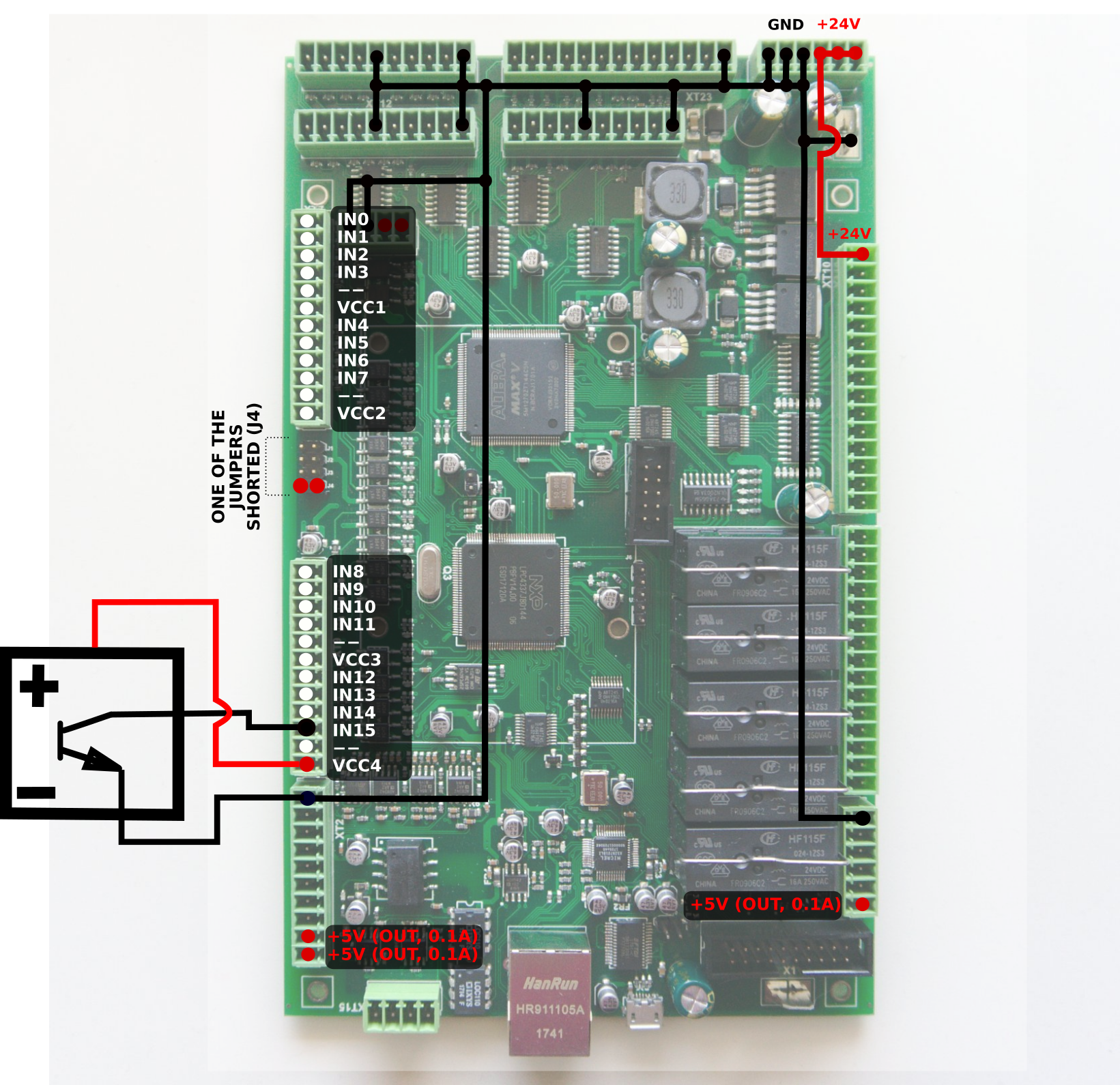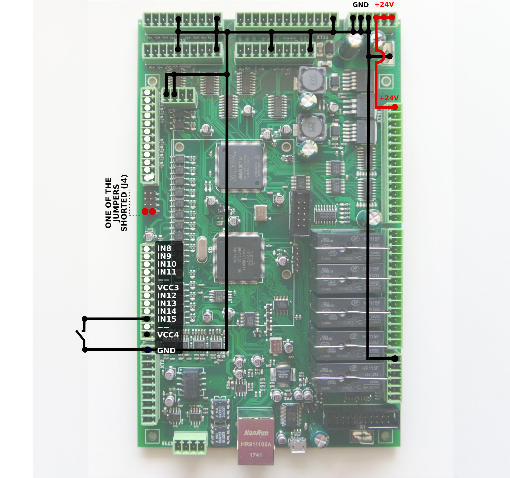 Common wire for 4 optocouple units is connected to internal +24V if Jumper is closed. Switch should short another optocouple input to GND (0V) to activate input pin.