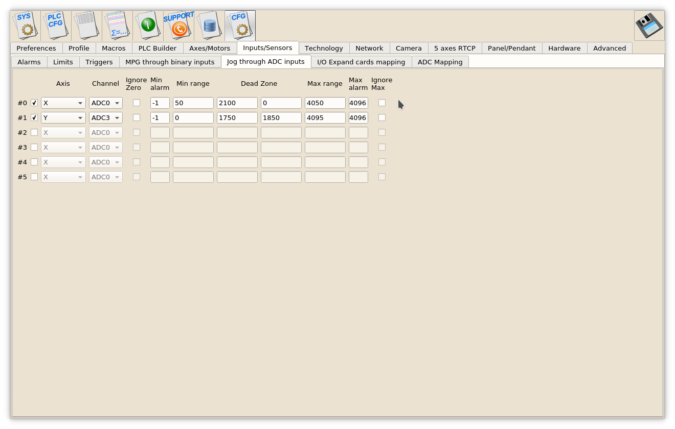Similarly, for ADC0 (with a range of 0-5V), a voltage divider with a 1:50 ratio is required (for voltages up to 300V). On older (prior to 2020) models of the myCNC-ET7 controller, the range on the ADC0 inputs was similarly 0-12V, however in the interest of user convenience the two ADC ports can now be used for a variety of power sources and voltage dividers.