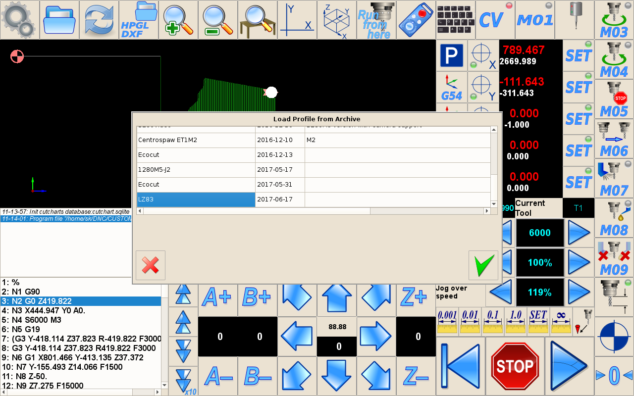 It is also possible to override the default profile when starting the myCNC program from the command line, using the -p command line switch. In the image below, the system will launch the X1366V tangential cutting profile when loading myCNC instead of the default profile, using the '/opt/myCNC/ubuntu18_64/myCNC' -pX1366V command: