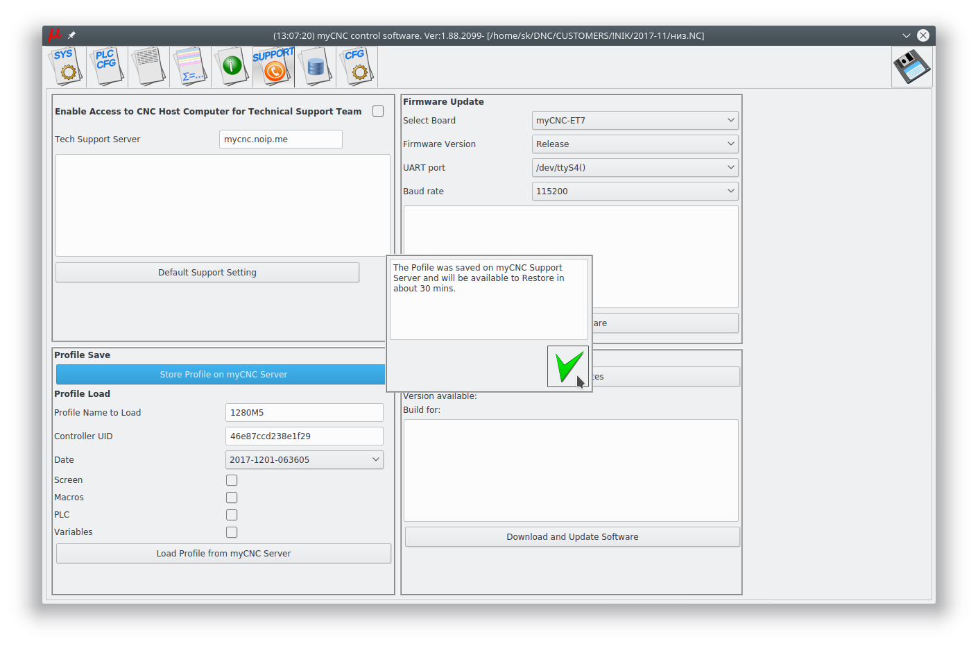 Current Profile can be stored, restored or updated from myCNC Server. Store, restore and update profile can be made in the “Support” dialog.