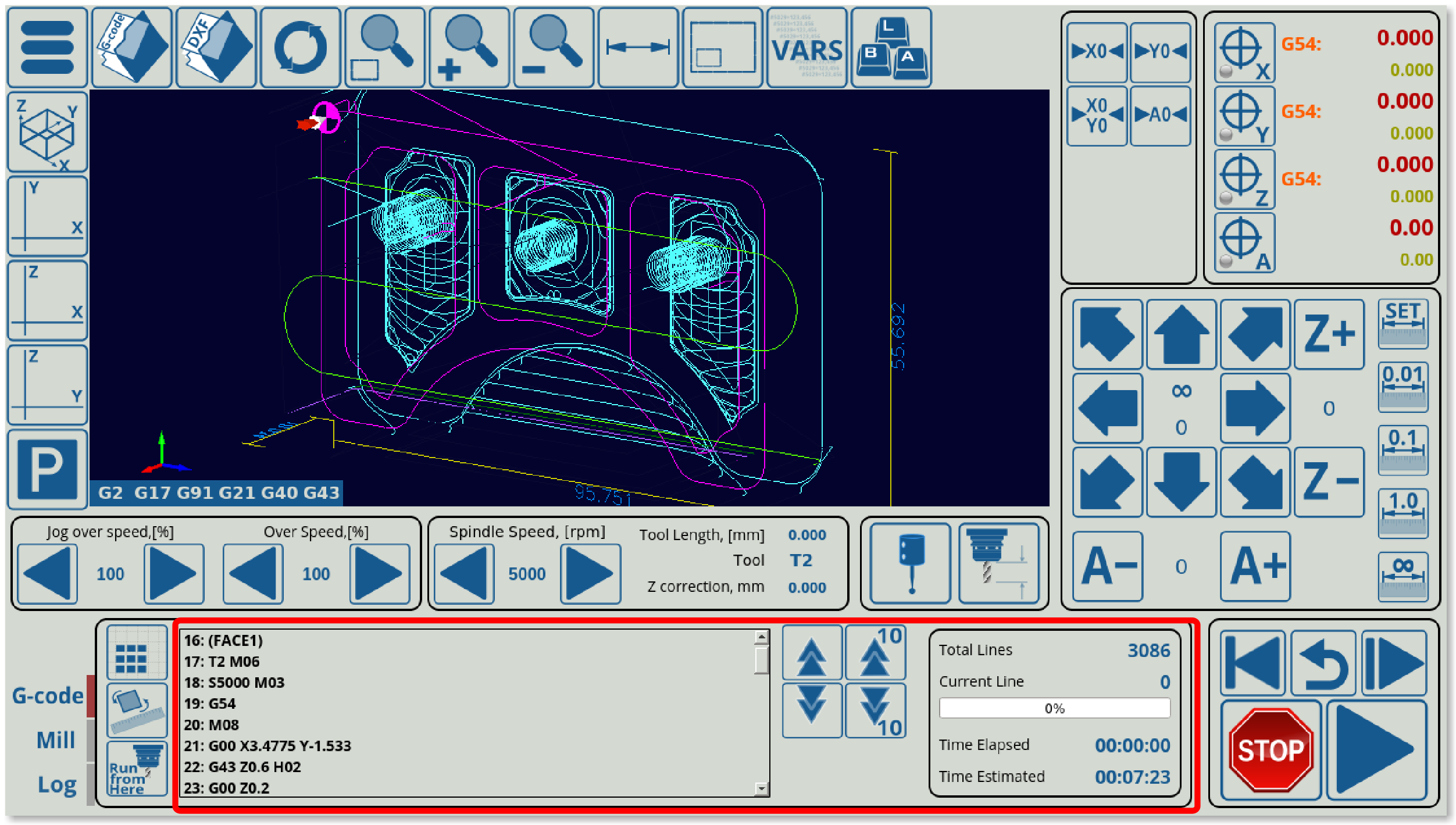 Notice that in the example above, the NCListView (the window that displays the G-code for the loaded control program) has been customized to feature a transparent background. In a similar way, other low-level GUI elements can be edited with custom colours that cannot othewise be accessed via the user-facing settings panel in myCNC Settings > Config > Screen > Colors.
