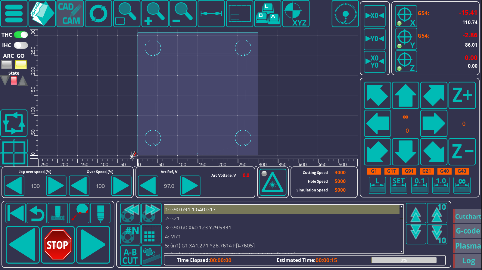 The LED panel on the left of the G-code tab shows the current state of the main plasma components (whether the plasma machine has power, if the arc sensor is on, the IHC indicator for the initial contact with the metal, THC and THC Low Speed LEDs which indicate whether the Torch Height Control is ON or OFF, and the Scriber LED which shows if the marking process is on or off (marking can be done with a smaller plasma torch or with an etching working tool):
