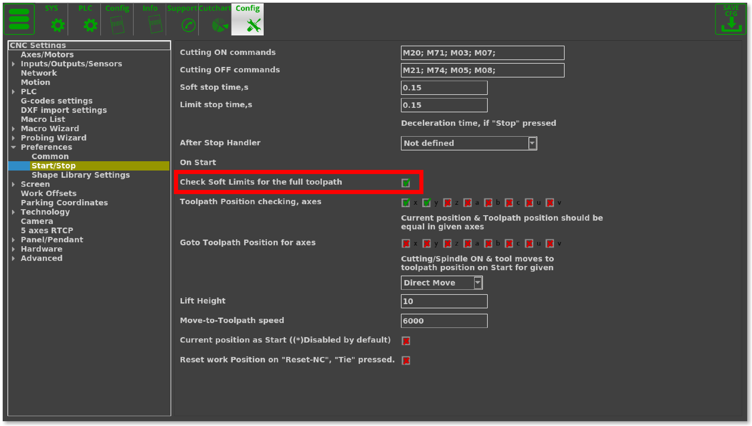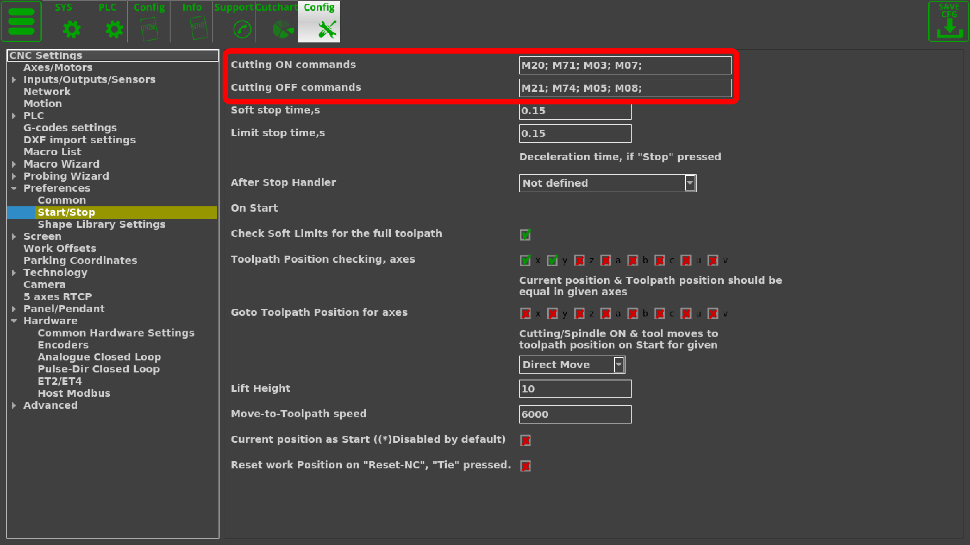 With the simulation mode turned ON, the software will ignore the cutting commands, simply moving the working bit (plasma torch, laser pointer, etc) around to give the user an option of running the program before the actual cutting begins. The commands which the myCNC software will ignore can be specified in the Settings > Config > Preferences > Start/Stop, as seen in the image below: