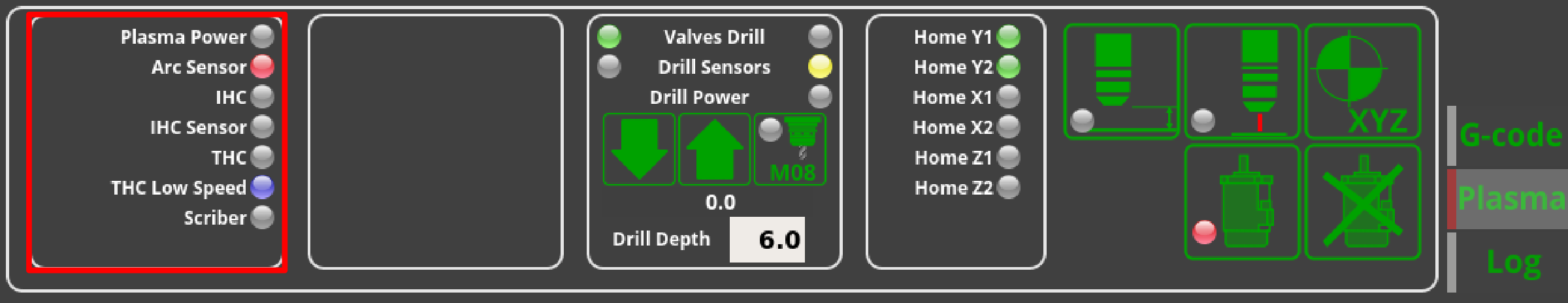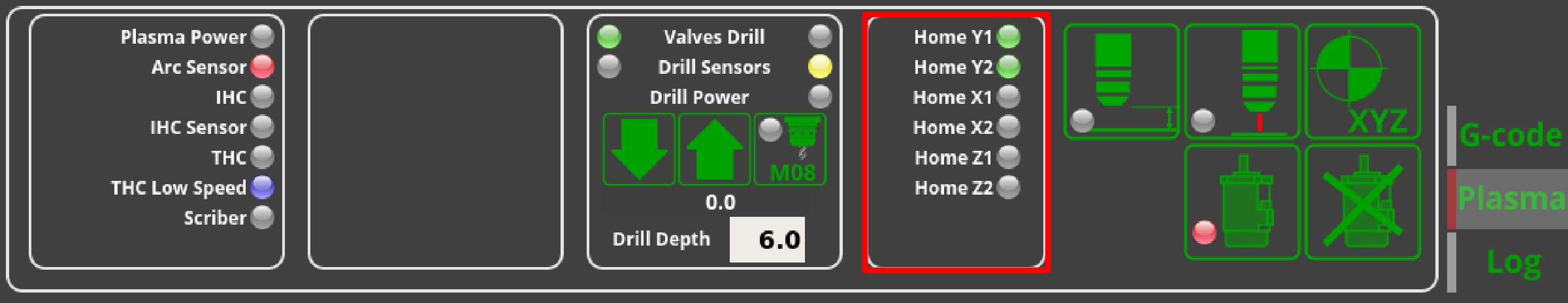 The homing sensors LED show two sensors per the X, Y and Z axes. Not all of these sensors are commonly used during the homing procedure on different machine setups, so the user is free to edit the x-plasma.xml