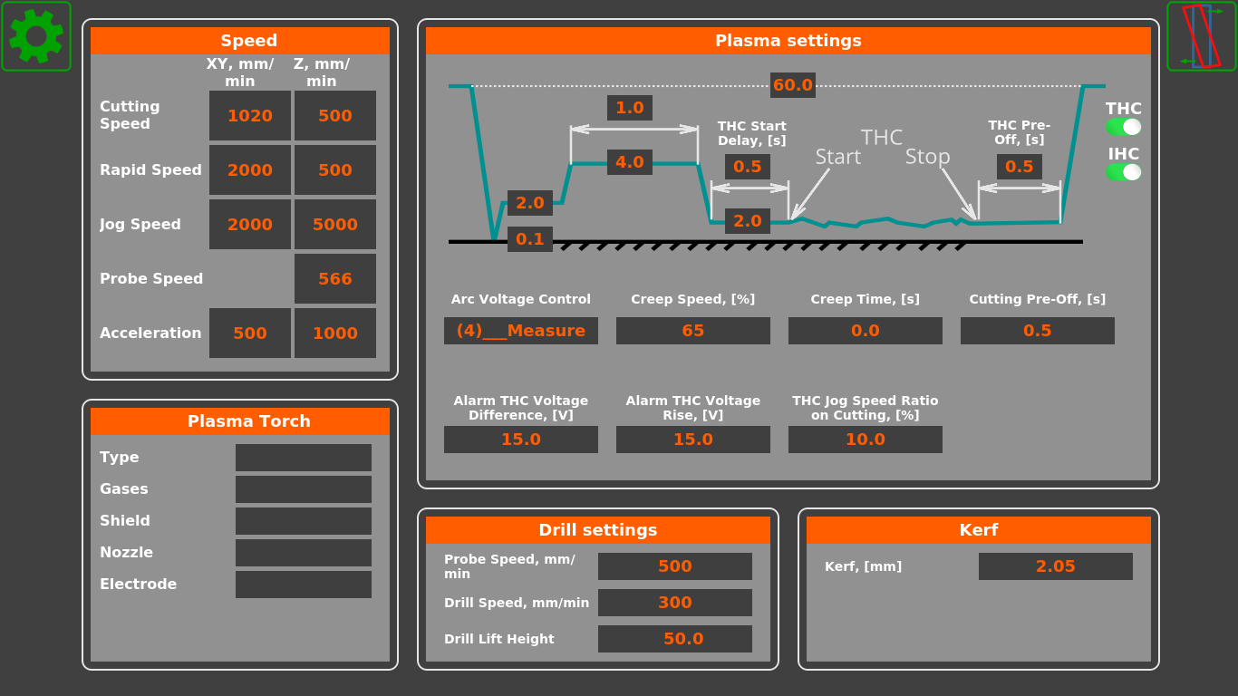 This settings window allows to specify the distances within the plasma cutting cycle, as well as functions such as THC and IHC. It also serves as the quick settings window which is always accessible to the operator, as opposed to the general settings, which might be open or closed to the operator depending on the software configuration that the user decides to employ.