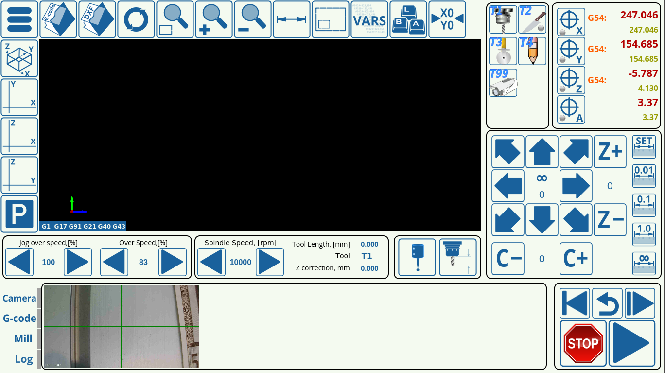 The configuration of the tangential knife profile is similar to that of a 4-axes mill profile, which can be found here. The notable differences between the two profiles lie in the addition of the following functions designed specifically for the tangential knife cutting applications. These buttons allow for easy switching between the different tools that may be part of the overall machine: