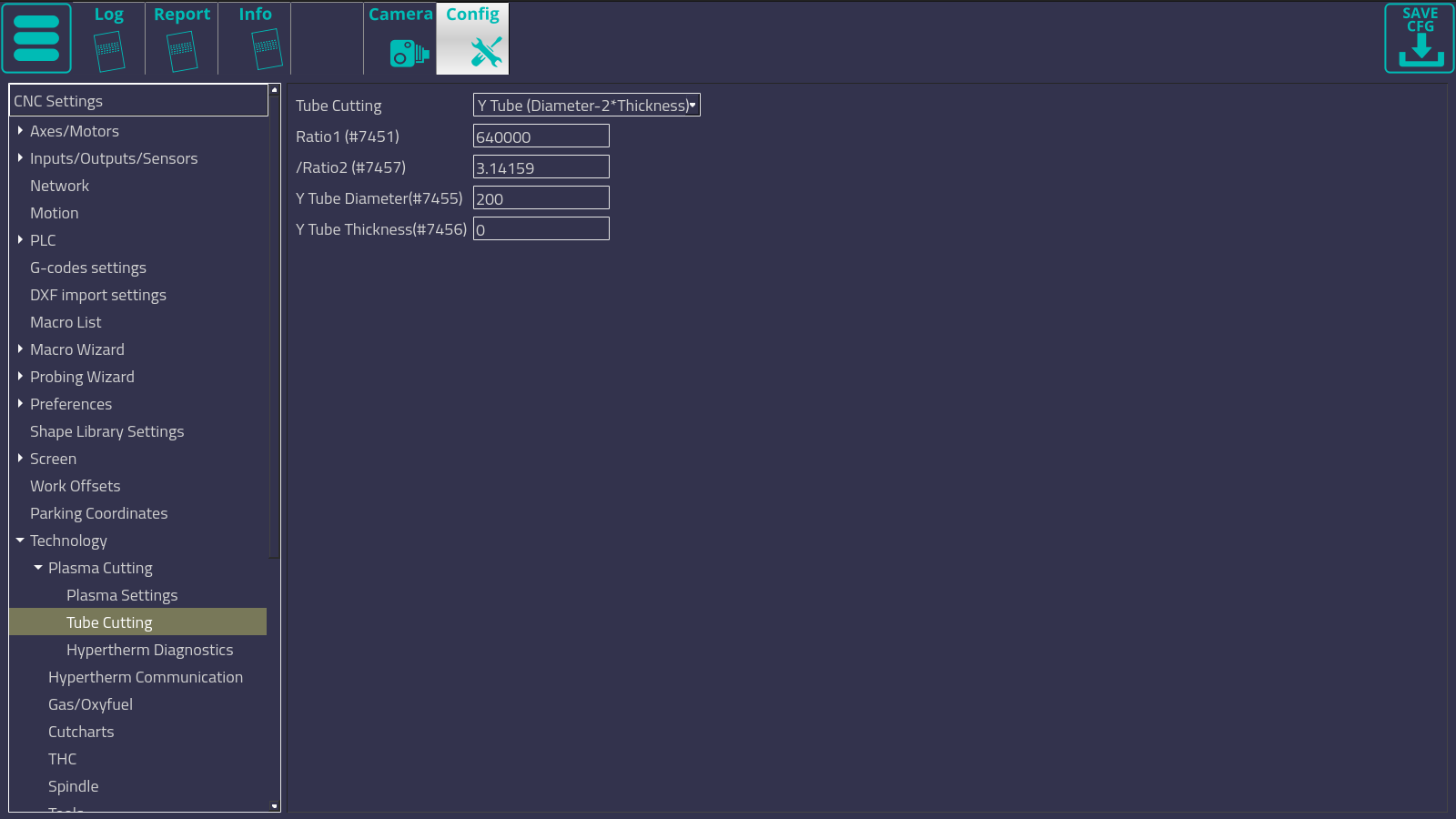 The configuration settings are available in Config → Technology → Plasma Cutting → Tube Cutting.