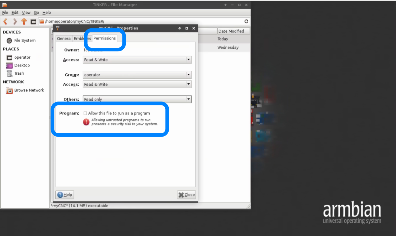 Press the right button on the myCNC icon, select “Properties” from the popup menu.