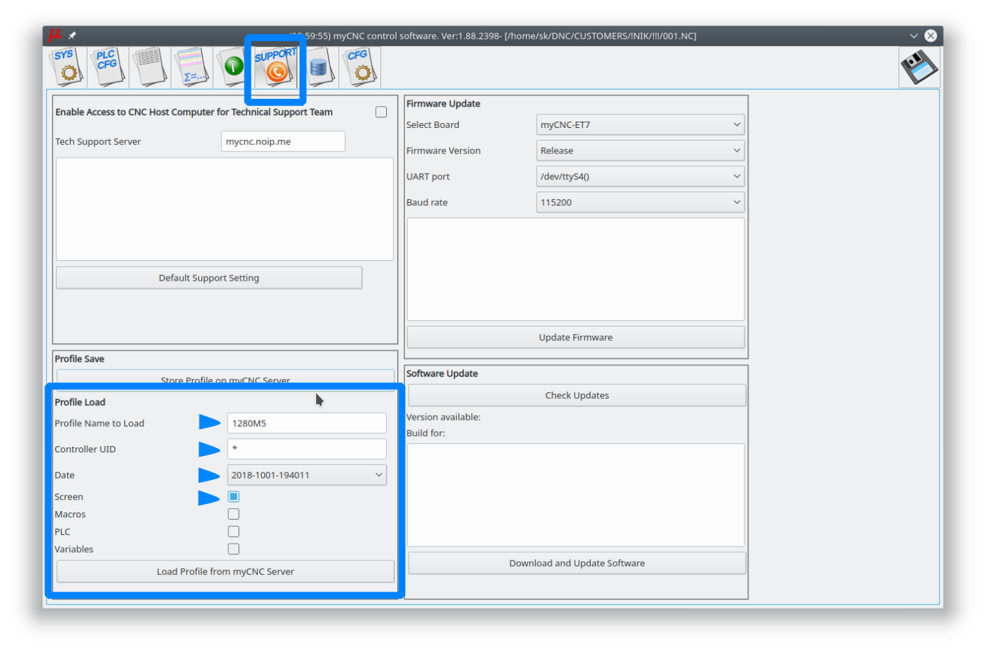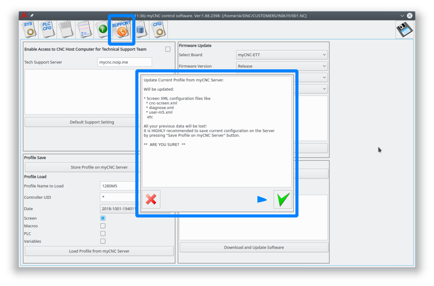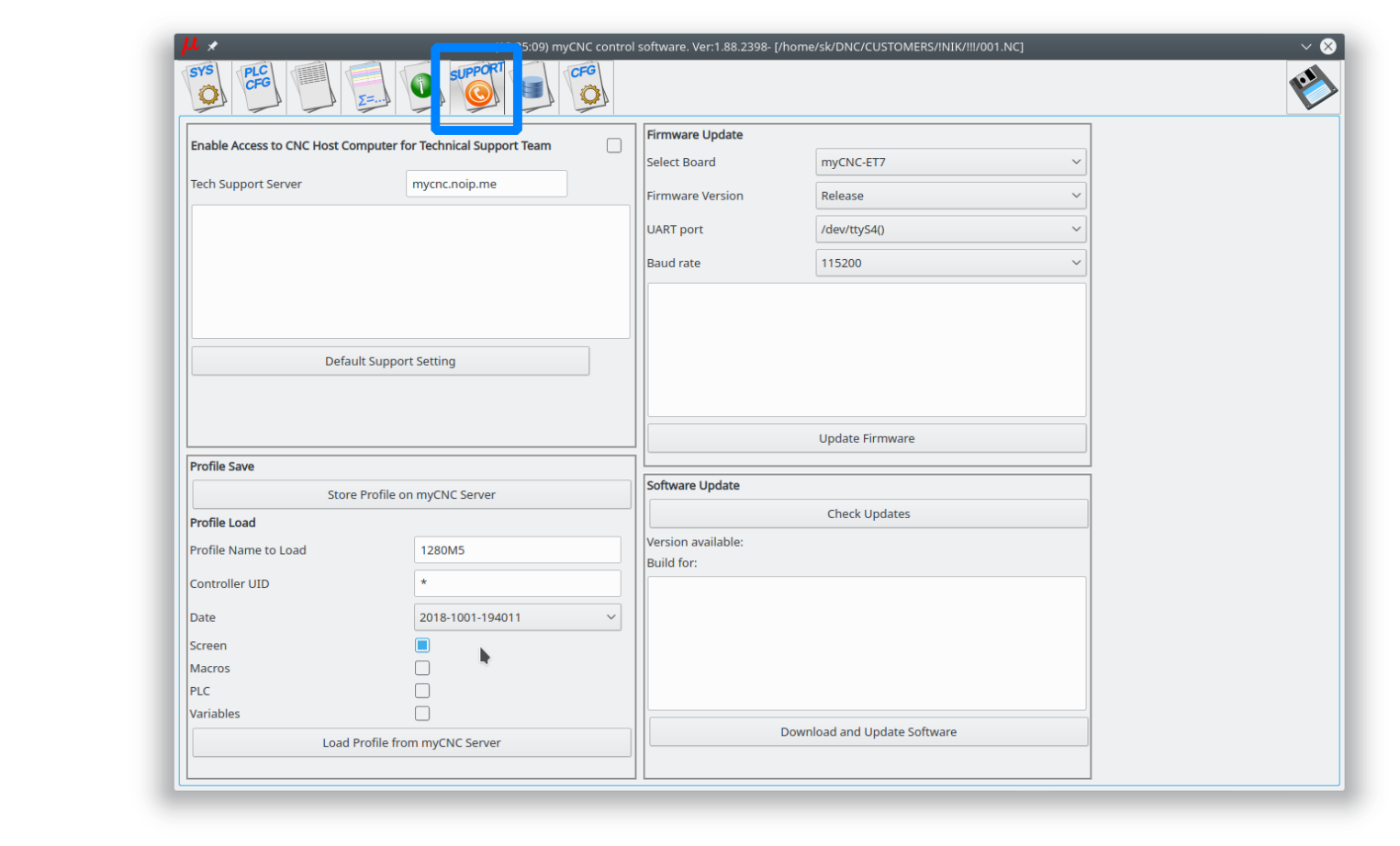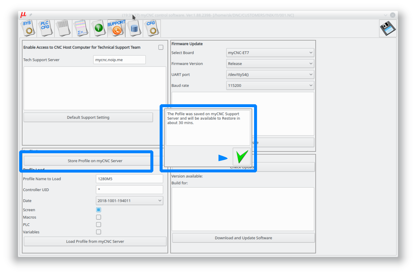 Current myCNC profile configuration can be stored, restored or updated from our Server.