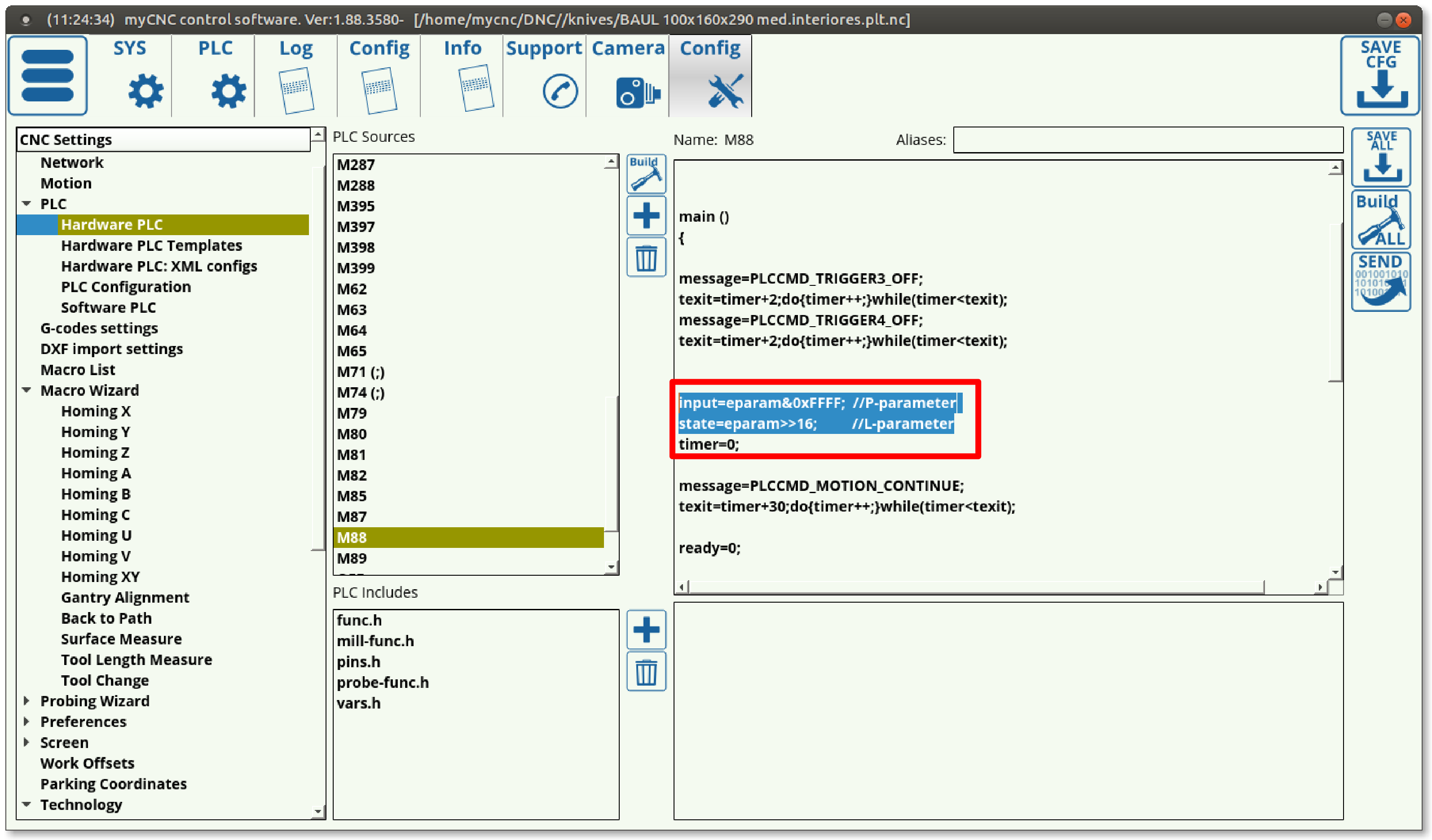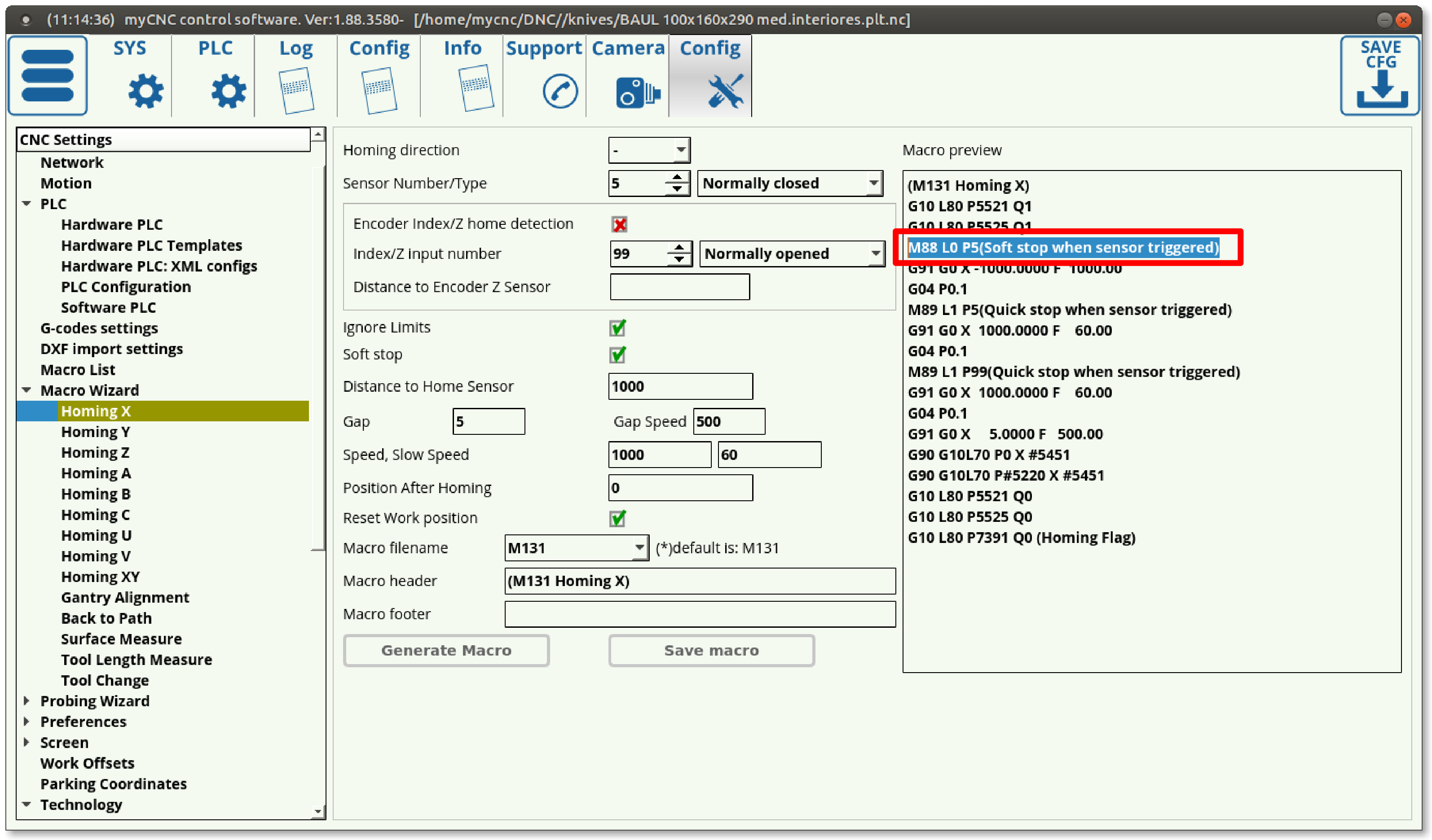 In this M88 code, you can see the eparam variable being “imported” into the macro that has been summoned by the G-code command. In this particular case, this allows to set the state and the necessary input number to monitor in order to initiate a soft stop when a particular sensor is triggered.