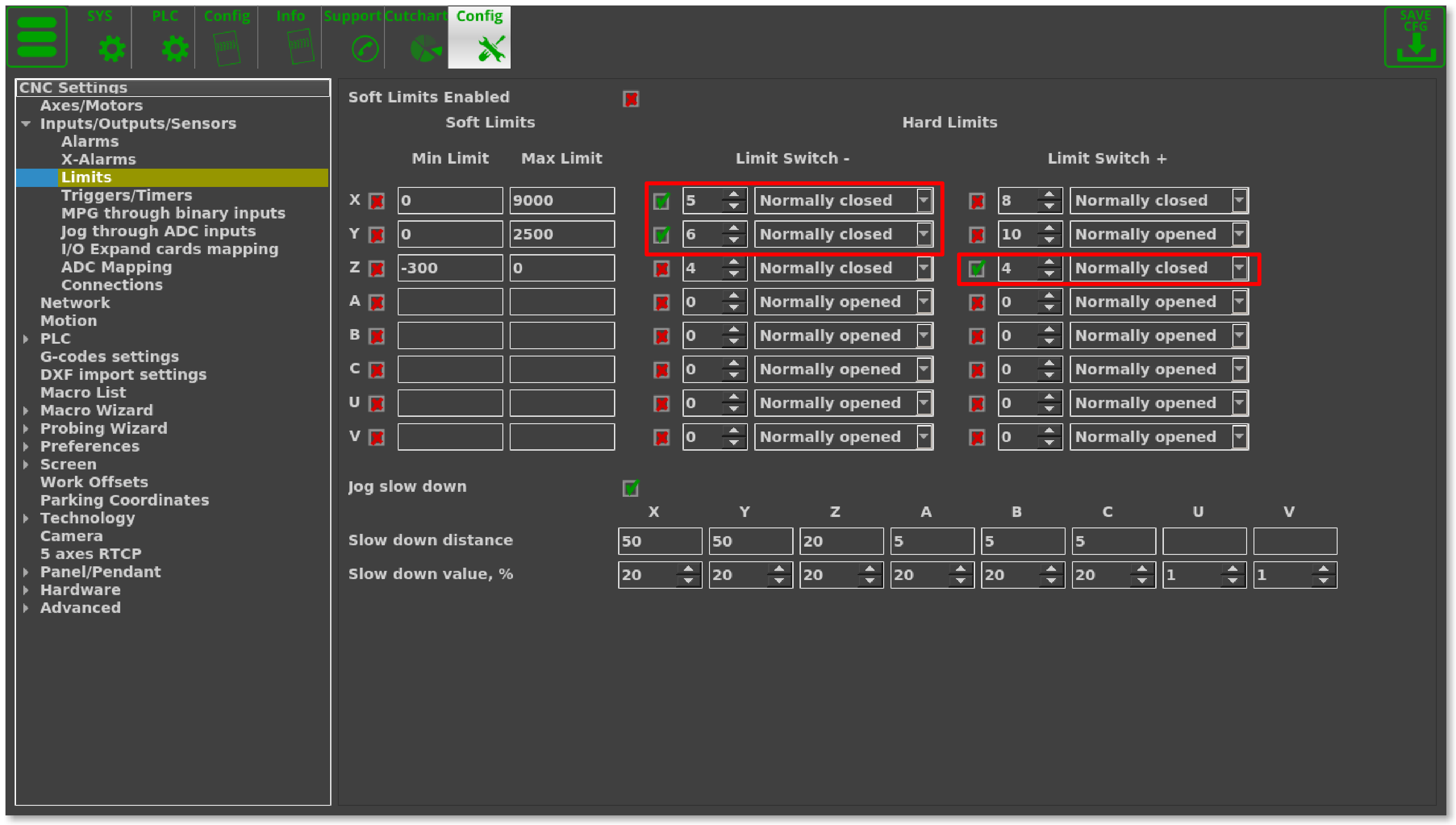 Кроме того, входы также должны быть сконфигурированы в диалоге настроек “Inputs/Sensors” - “Limits”, если датчики для хоуминга также используются как концевые датчики. Если в качестве концевых выключателей используются датчики Home, как показано в таблице ниже,