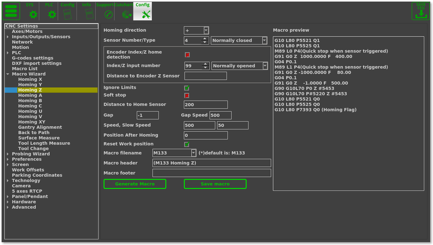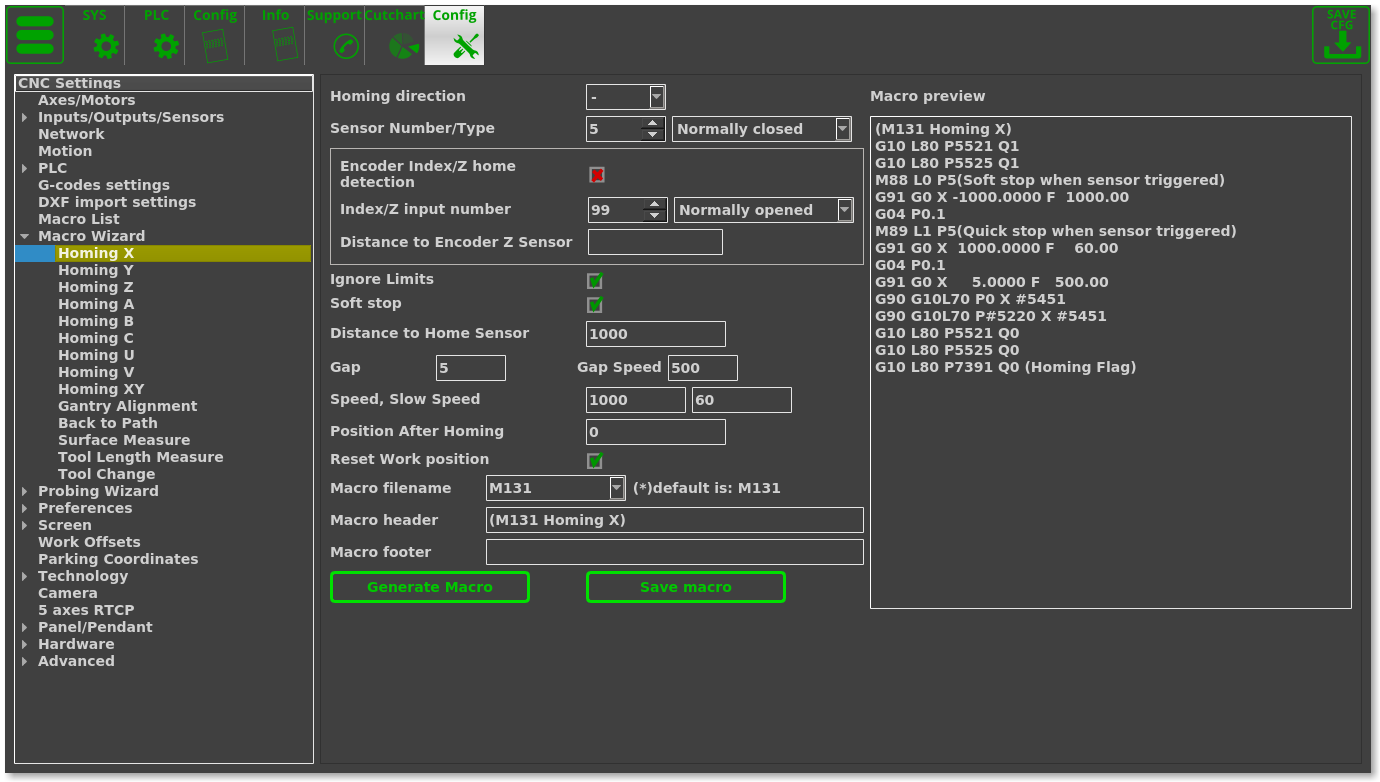 Номера датчиков хоуминга должны быть настроены в Macro Wizard. Также необходимо сгенерировать процедуры наведения для осей X, Y, Z.