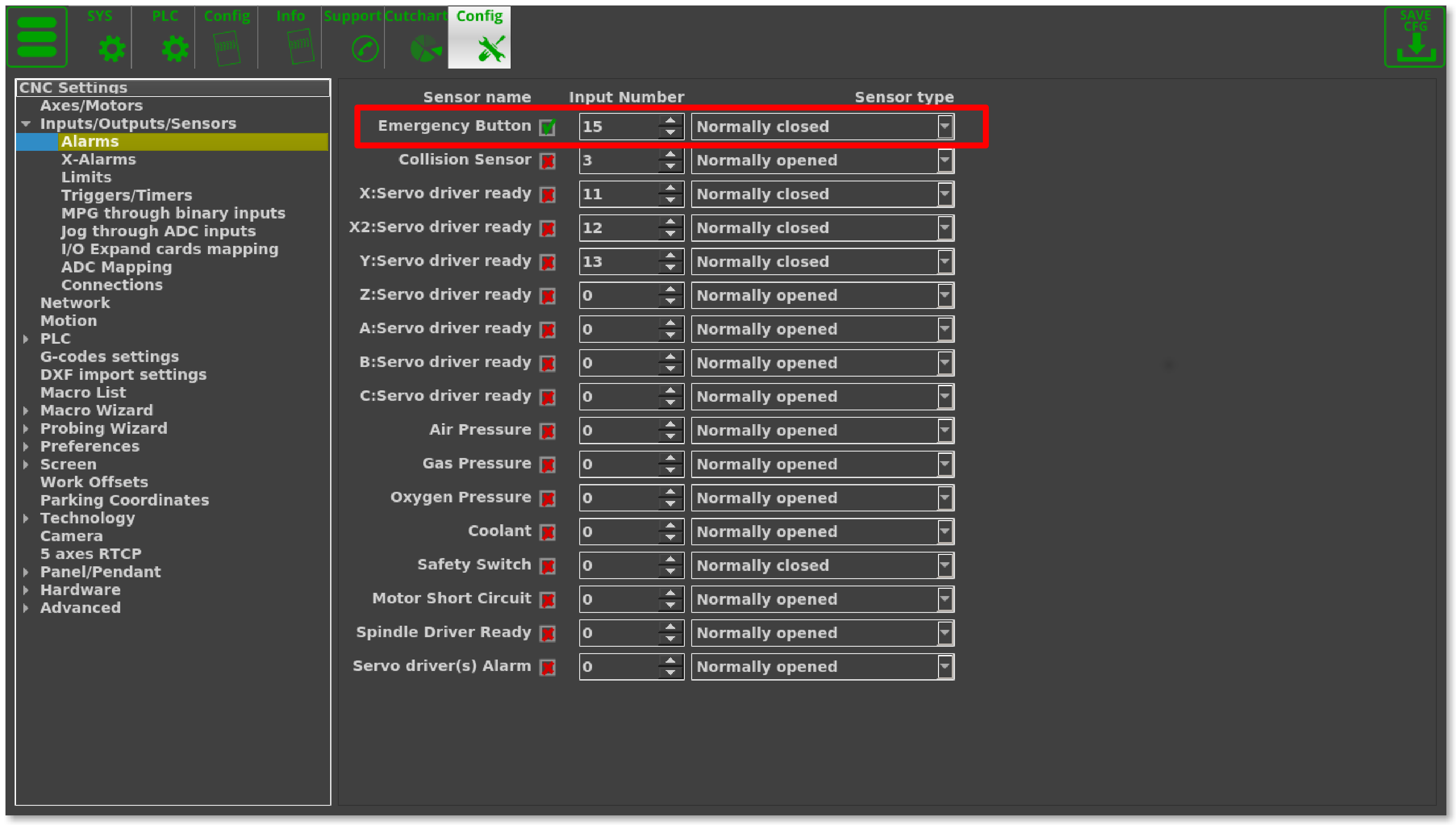 Аварийная остановка должна быть настроена в диалоговом окне Alarms (Settings > Config > Inputs/Outputs/Sensors > Alarms. Такая аварийная кнопка показана ниже: