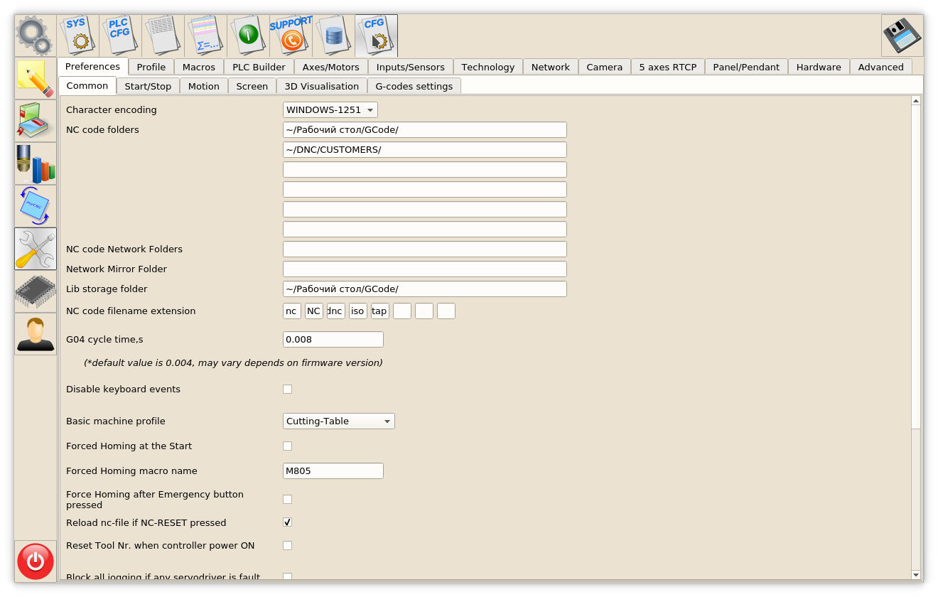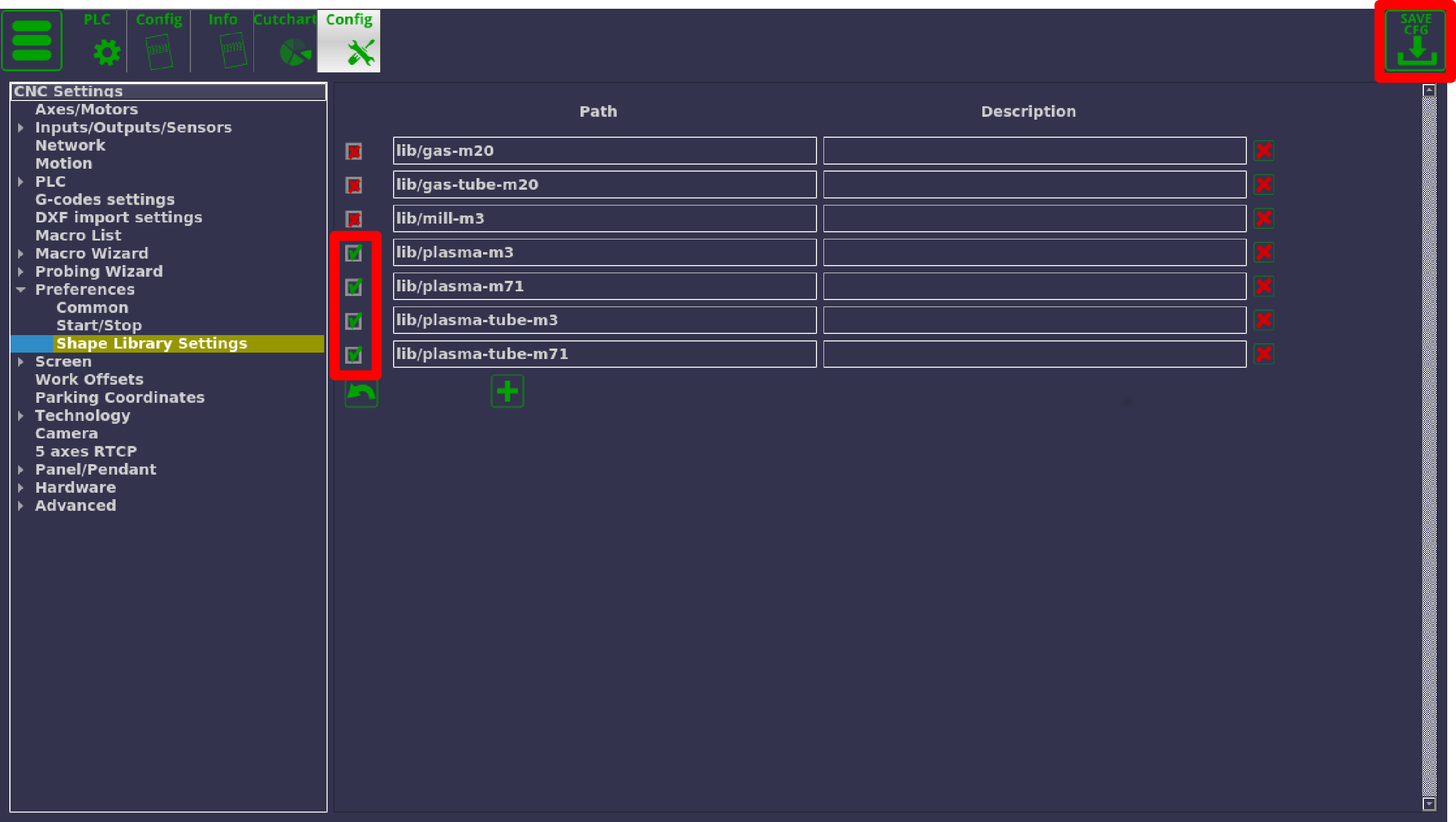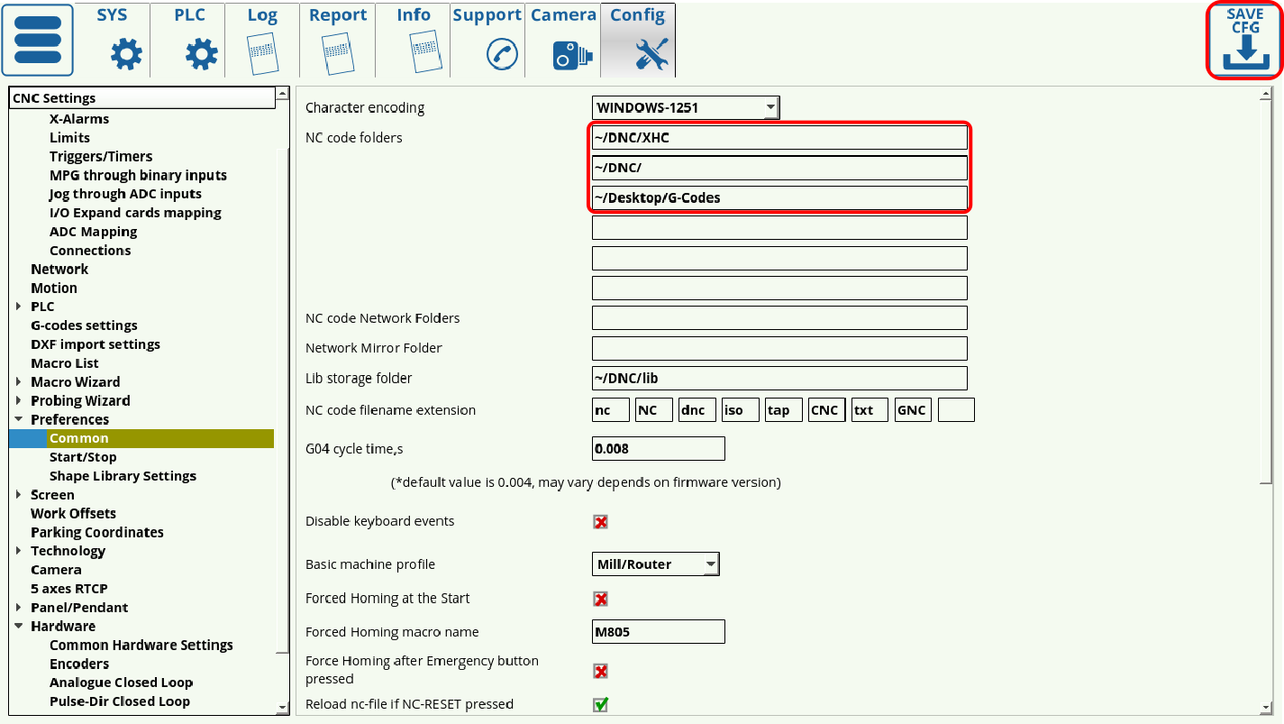 Файлы, которые вы пытаетесь загрузить, должны находиться в папках, указанных в Settings > Config > Preferences > Common > NC code folders. Если папка, из которой вы хотите загрузить файлы, отсутствует в этом списке, добавьте ее и нажмите кнопку «Сохранить конфигурацию»: