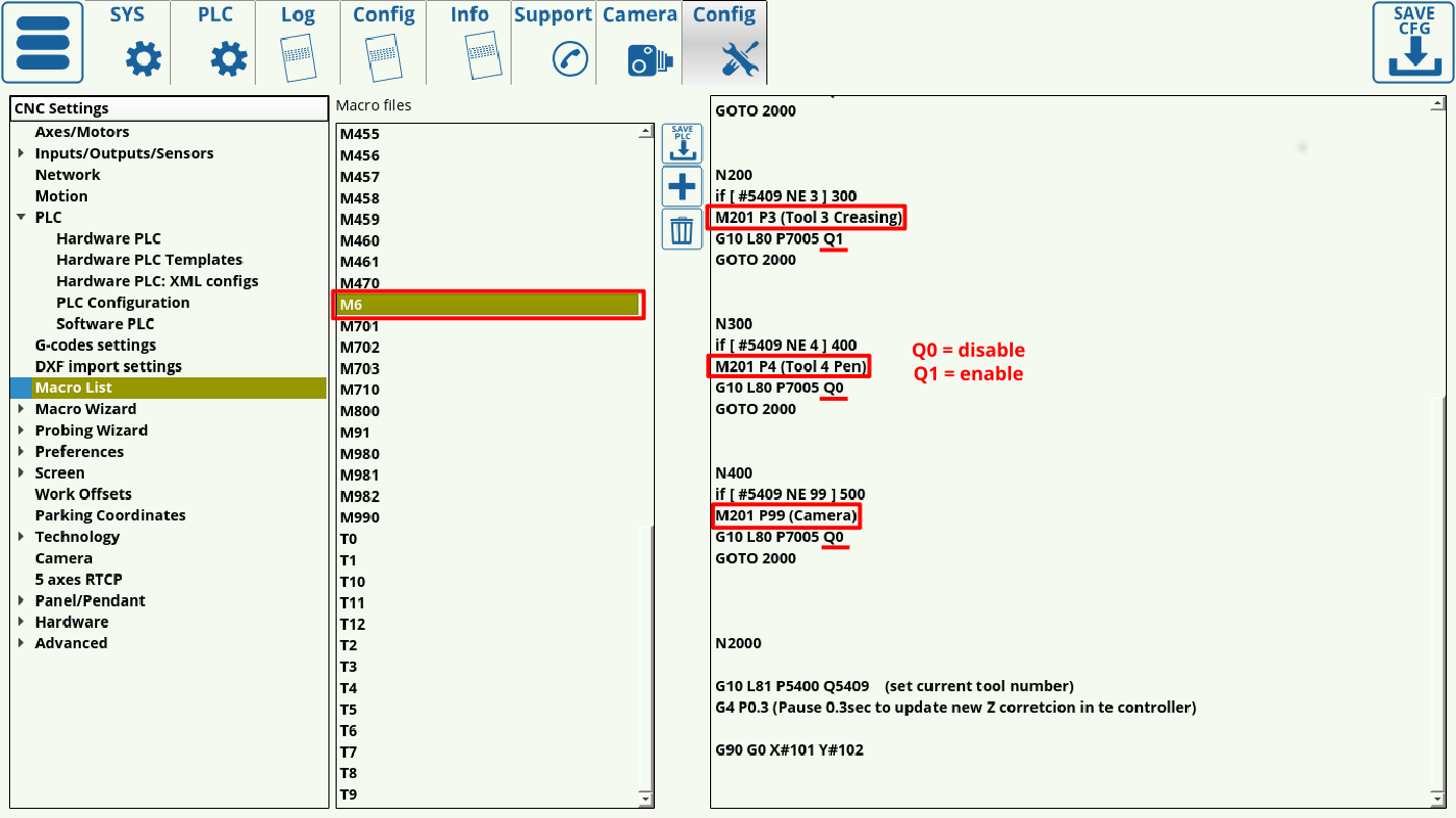 Макрос M6 содержит команды для включения и выключения функции тангенциальной резки. Можно проверить, какие инструменты в настоящее время назначены для использования тангенциальной резки, если это необходимо: