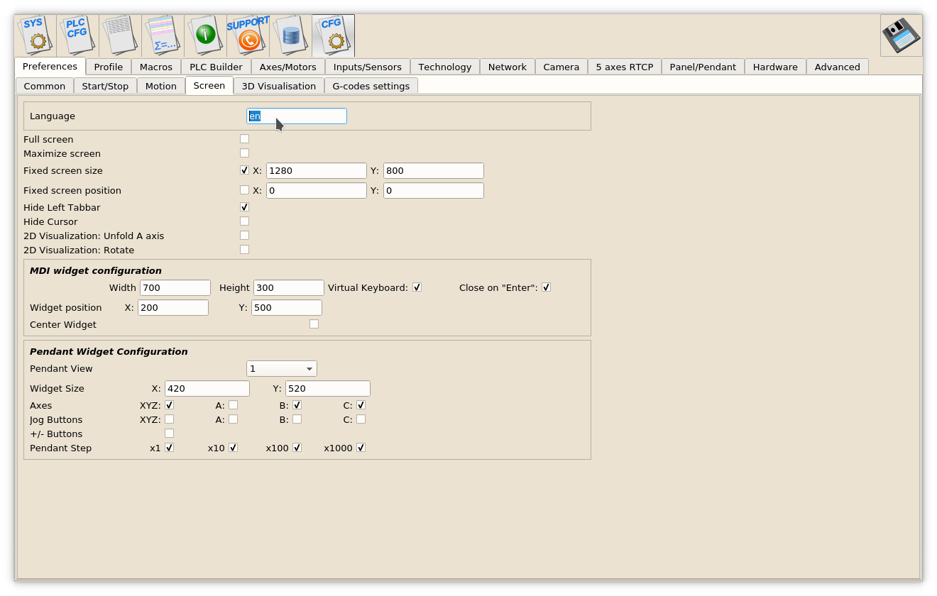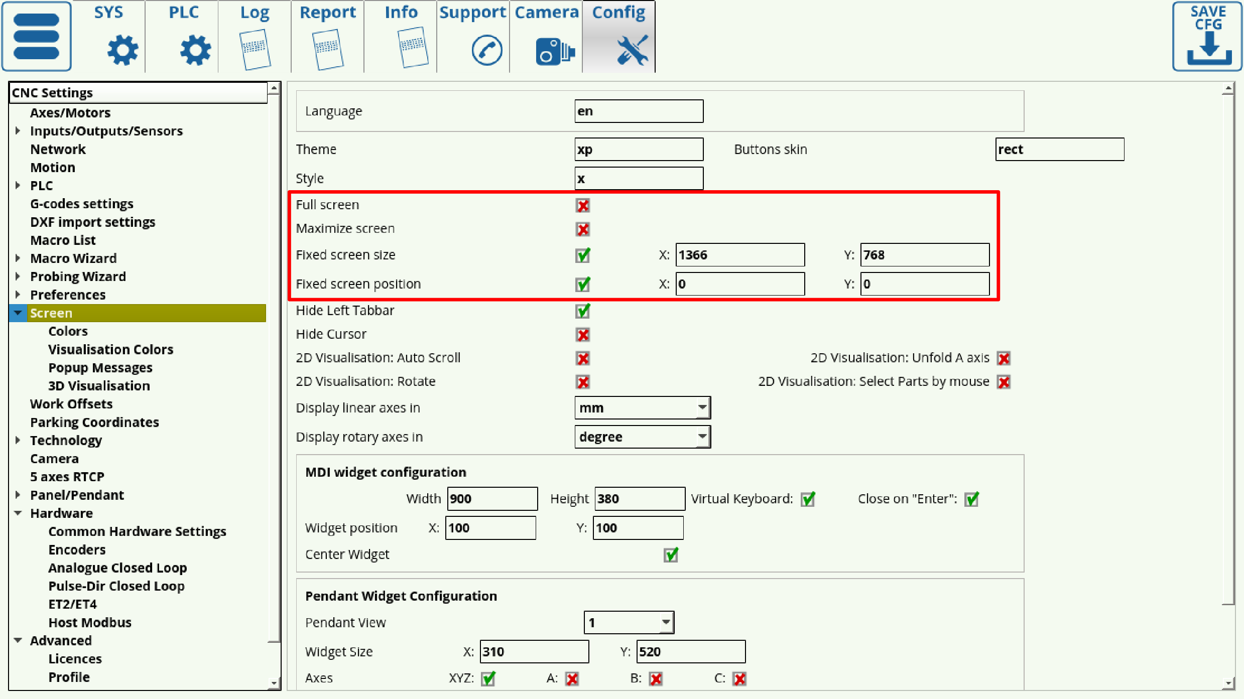 - Фиксированный размер экрана - установить размер в пикселях для главного экрана myCNC