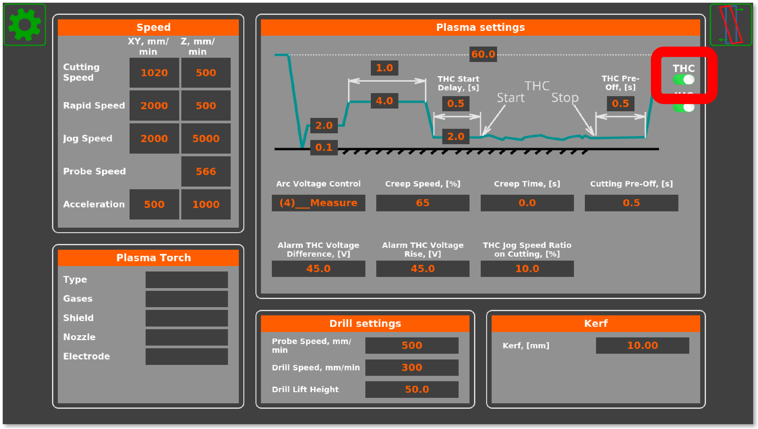 - В меню Settings > Config > Technology > THC убедитесь, что значения Alarm Arc Voltage Difference и Alarm Arc Voltage Rise не установлены на слишком низкое значение - в тех случаях, когда опорное и реальное напряжение слишком разные, низкое значение Alarm Arc Voltage Difference предотвратит запуск системы THC. Установите значение 1000, чтобы временно отключить эту функцию.